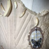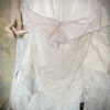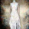 Weathered, wastelander bridal gown, lovingly handmade from plant-dyed cotton, mesh, lace and netting. The top part of the dress has a fully boned -part plastic and part metal boning- corset that laces at the back and has heavy duty metal clasps at the shoulderstraps. Its edges are deliberately frayed for a more weathered (but adequately finished for a durable garment) look. The front of the skirt is much shorter than the back. The back has a short lace train and fullness at the backside as you would see in a Victorian skirt. The teeth-details at the corset are synthetic – no animals where harmed!