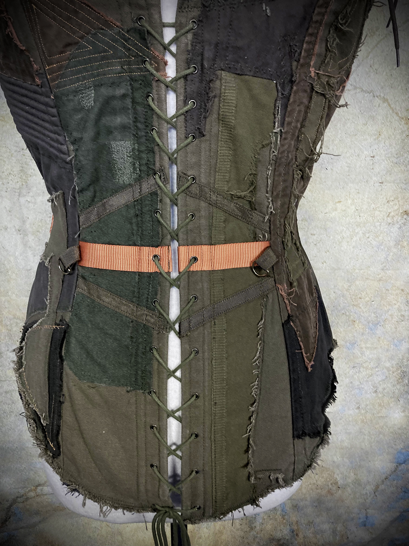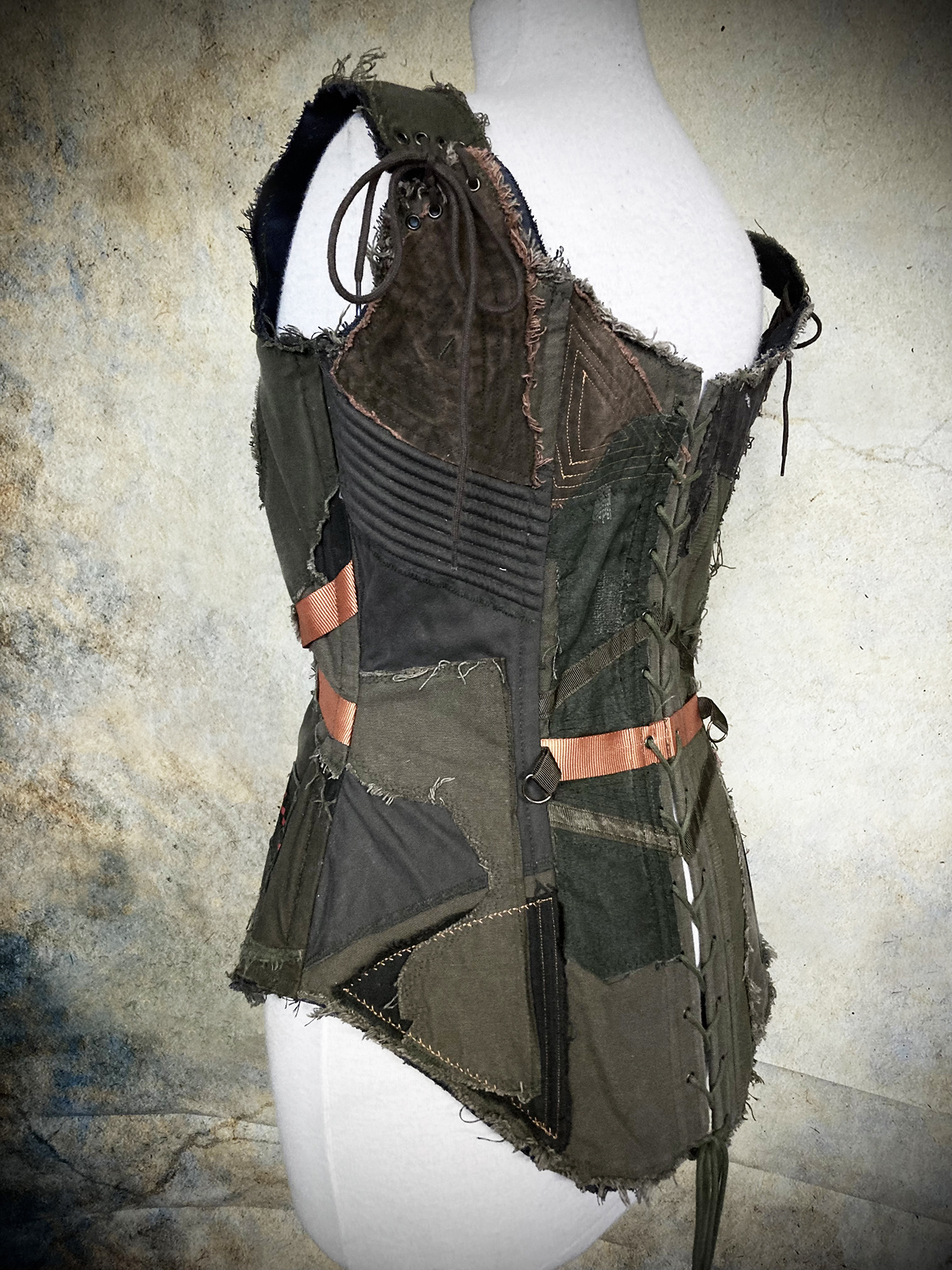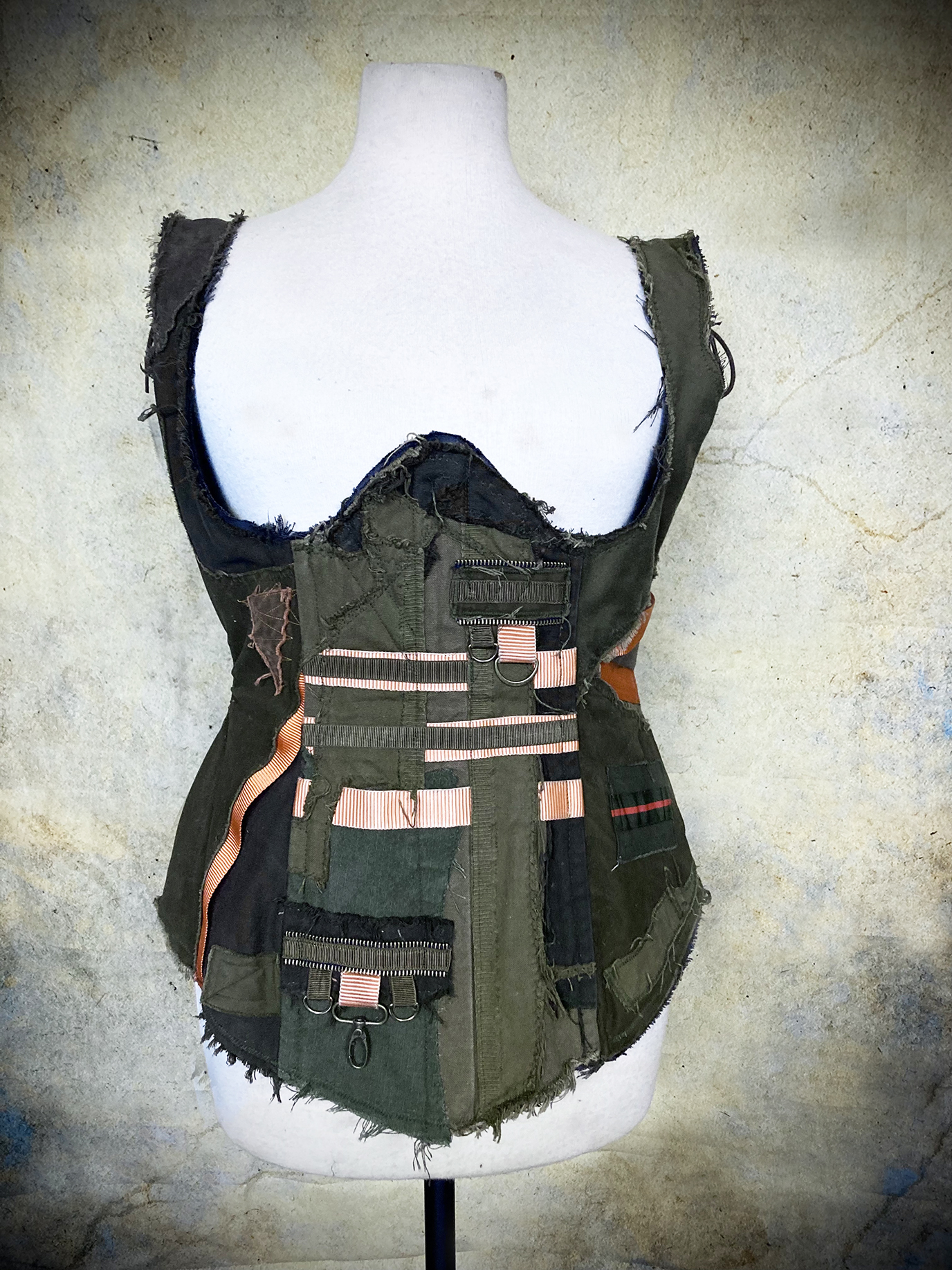 Gorgeous steel-boned Wastelander corset made from an incredibly intricate patchwork of weathered cotton fabrics, utility straps, eyelets, D-rings, stitching, zippers, clasps and ribbons. The corset has deliberately frayed edges and patches, but sound and sturdy construction.