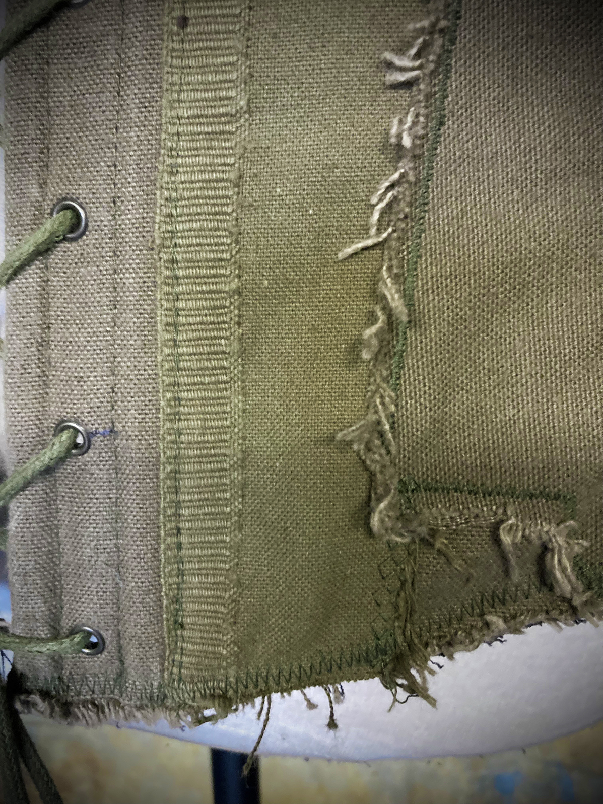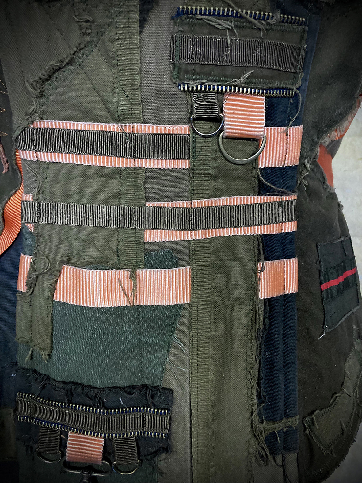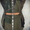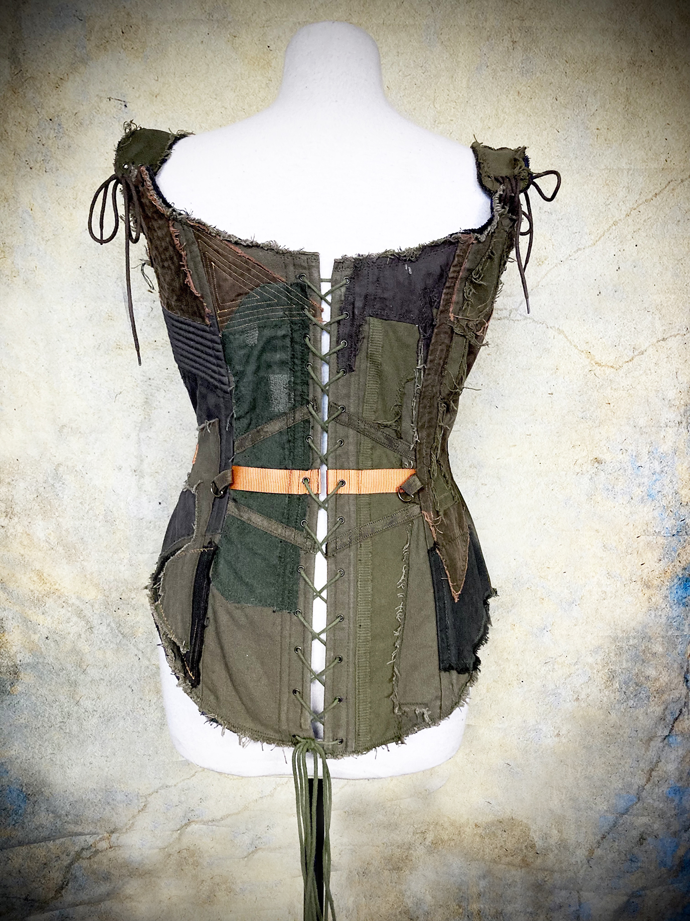 Gorgeous steel-boned Wastelander corset made from an incredibly intricate patchwork of weathered cotton fabrics, utility straps, eyelets, D-rings, stitching, zippers, clasps and ribbons. The corset has deliberately frayed edges and patches, but sound and sturdy construction.