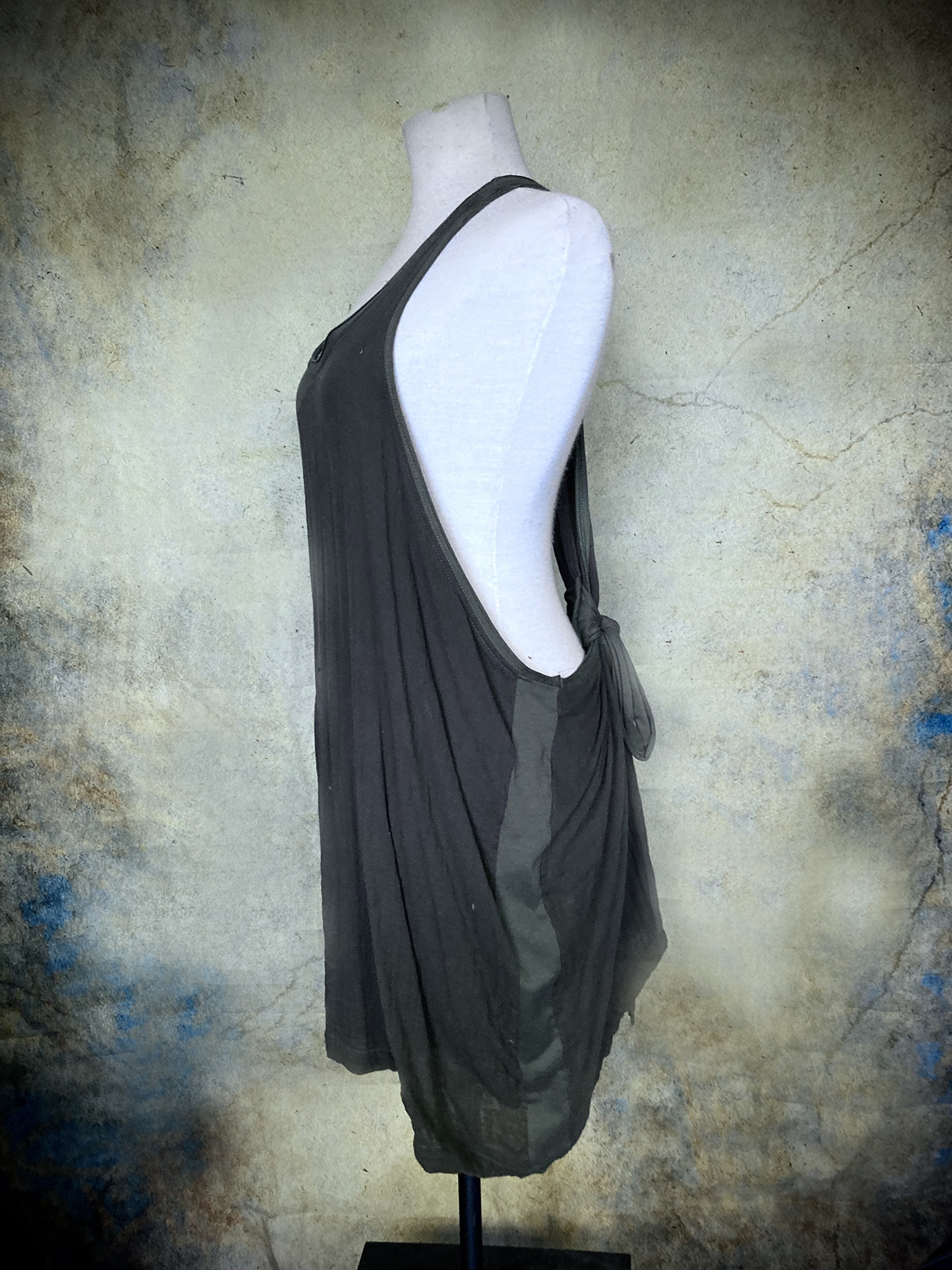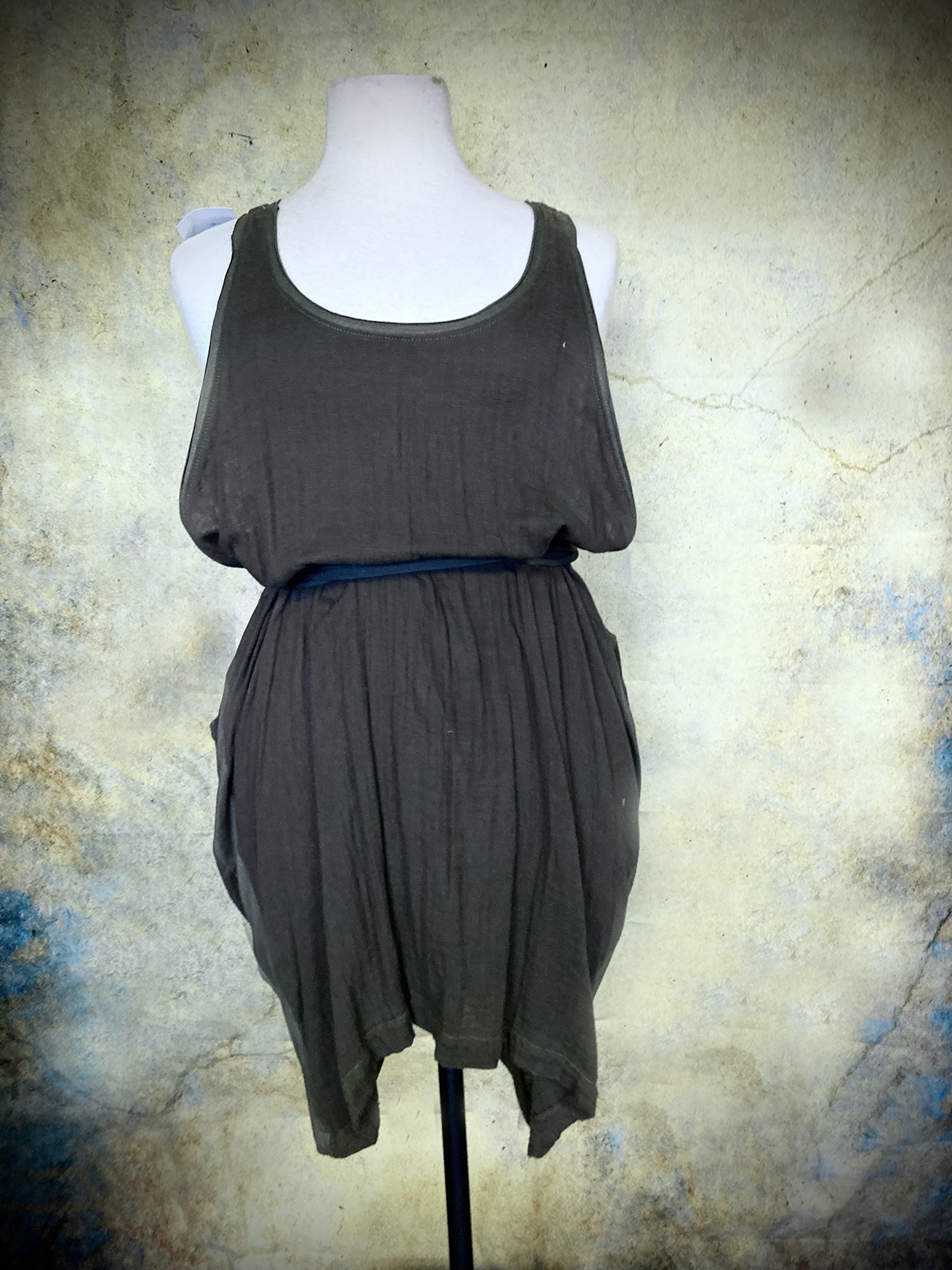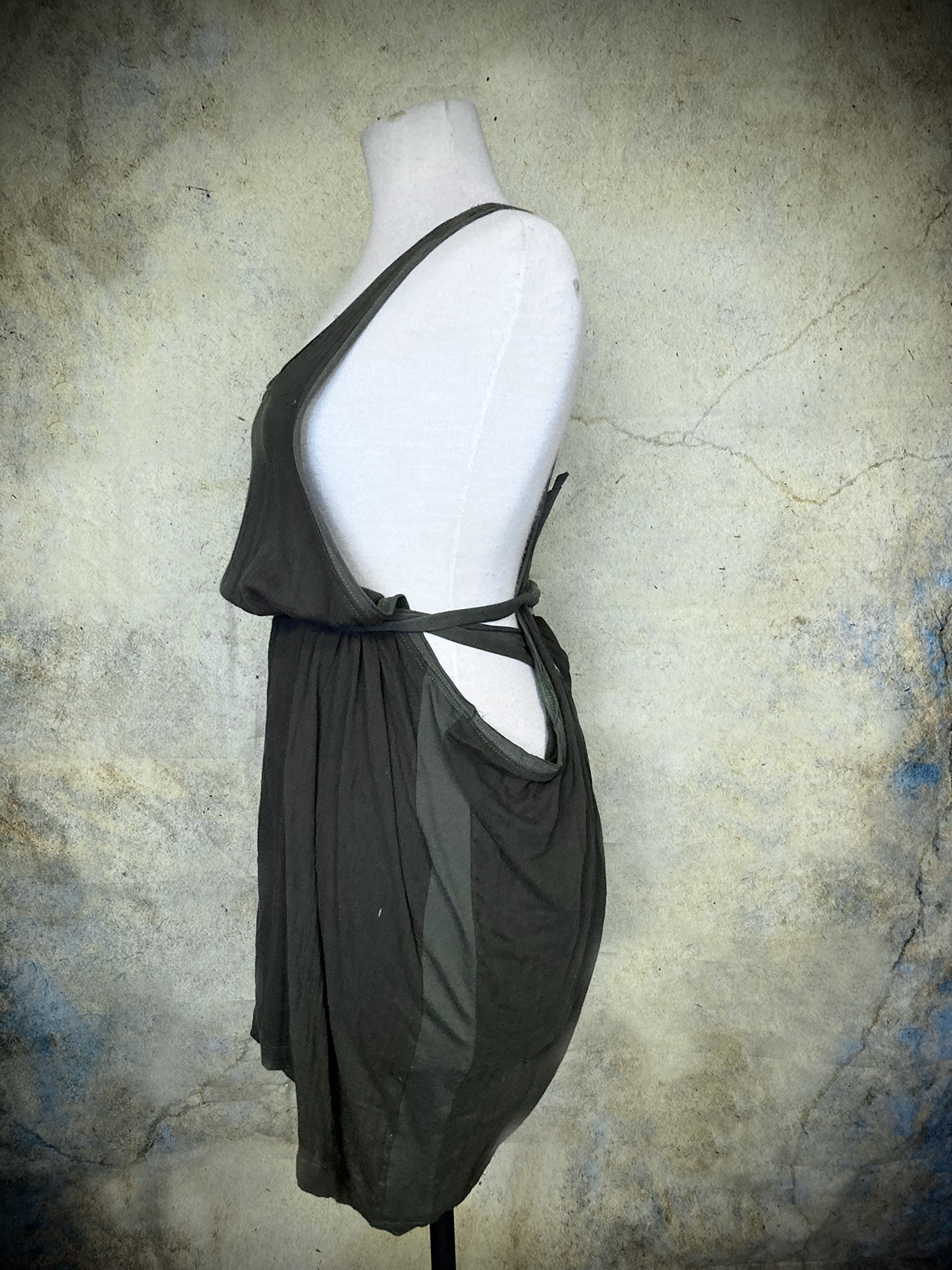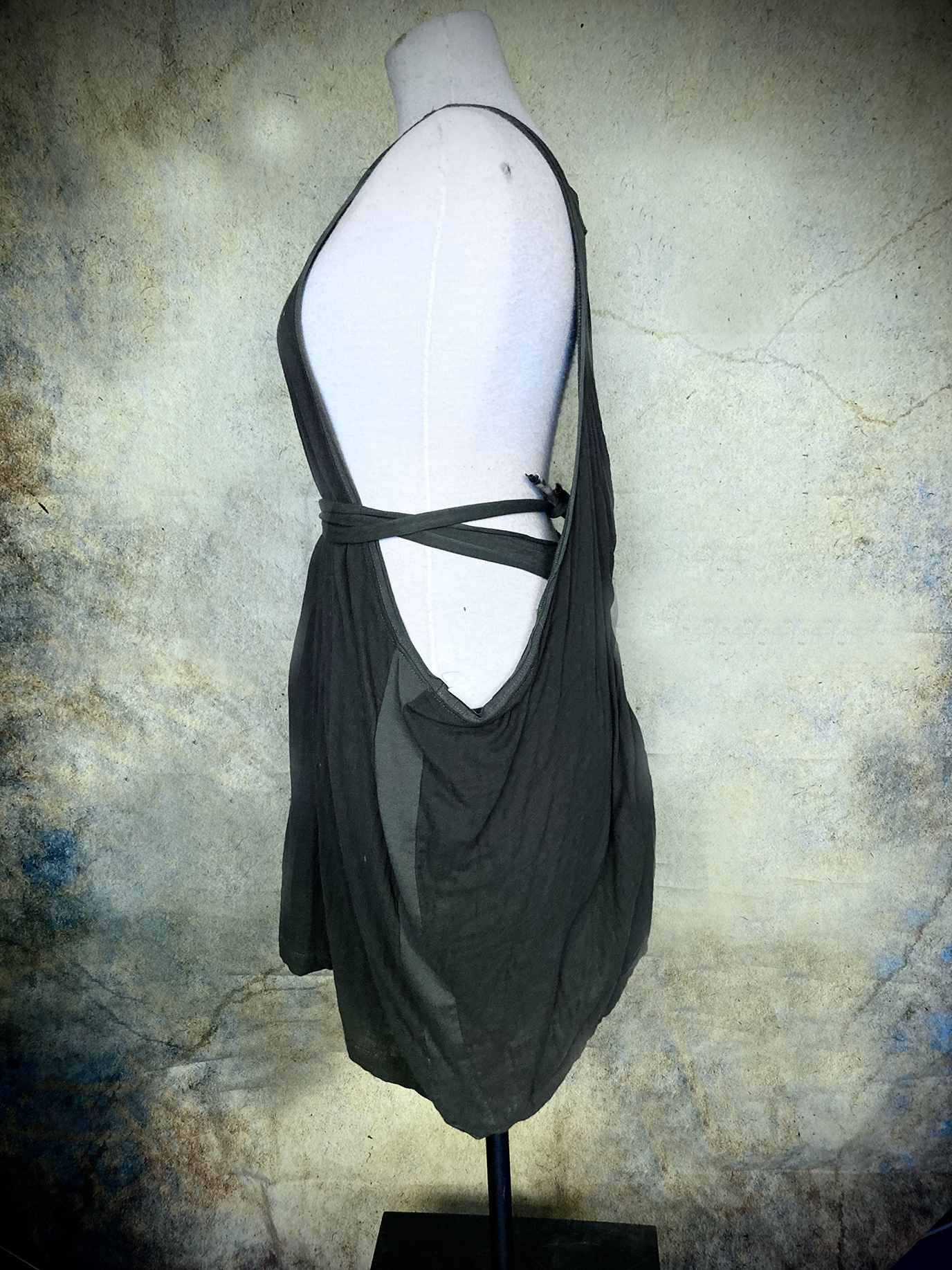 Made from comfortable armygreen cotton mesh and sage green jersey, this ‘sack dress’ can be worn in different ways by adjusting the strap that is attached to the back. The dress has a racerback and a ‘raw edge’ finished jersey binding at the sleeves and neckline.