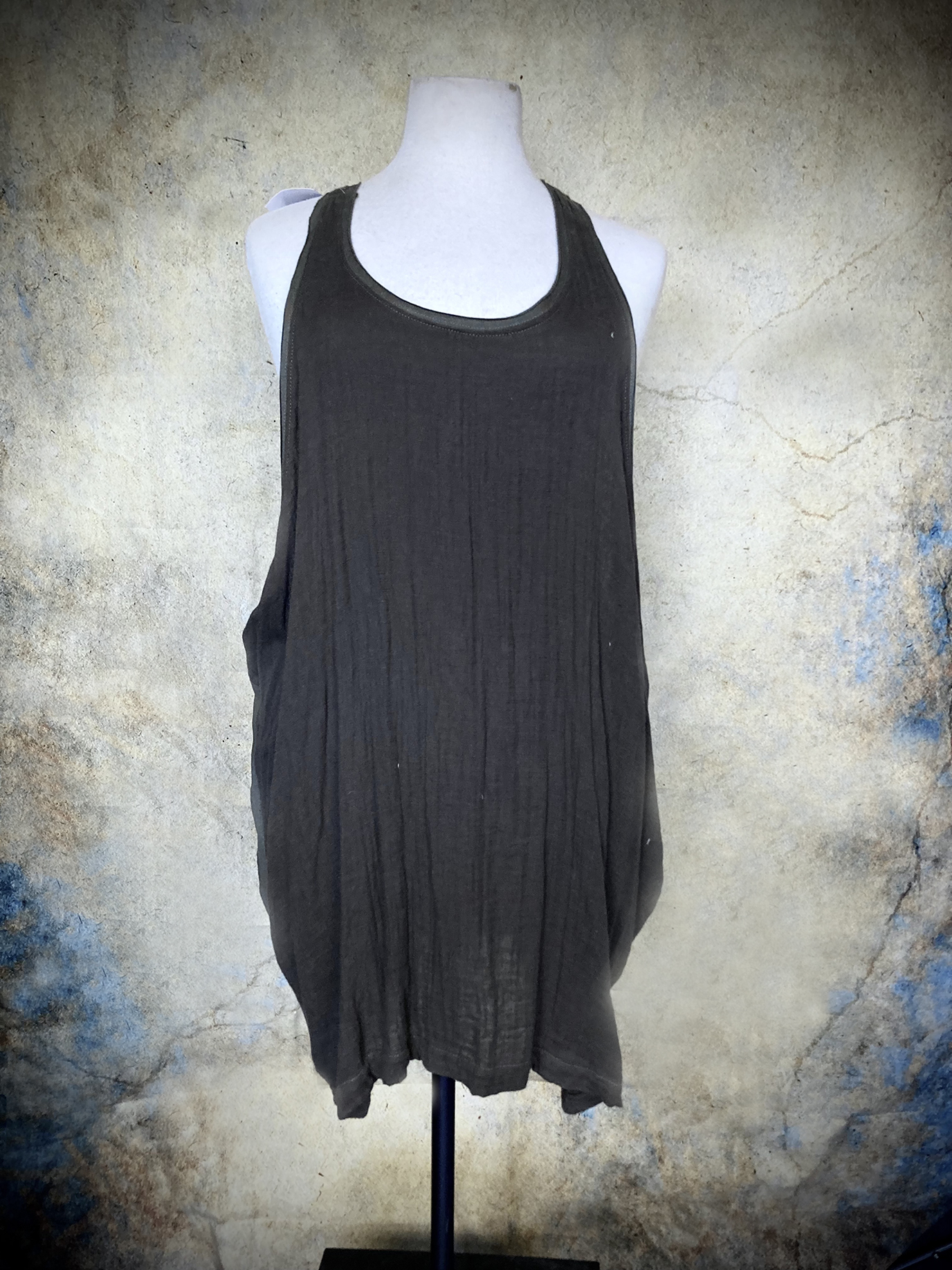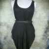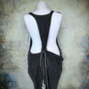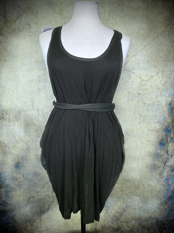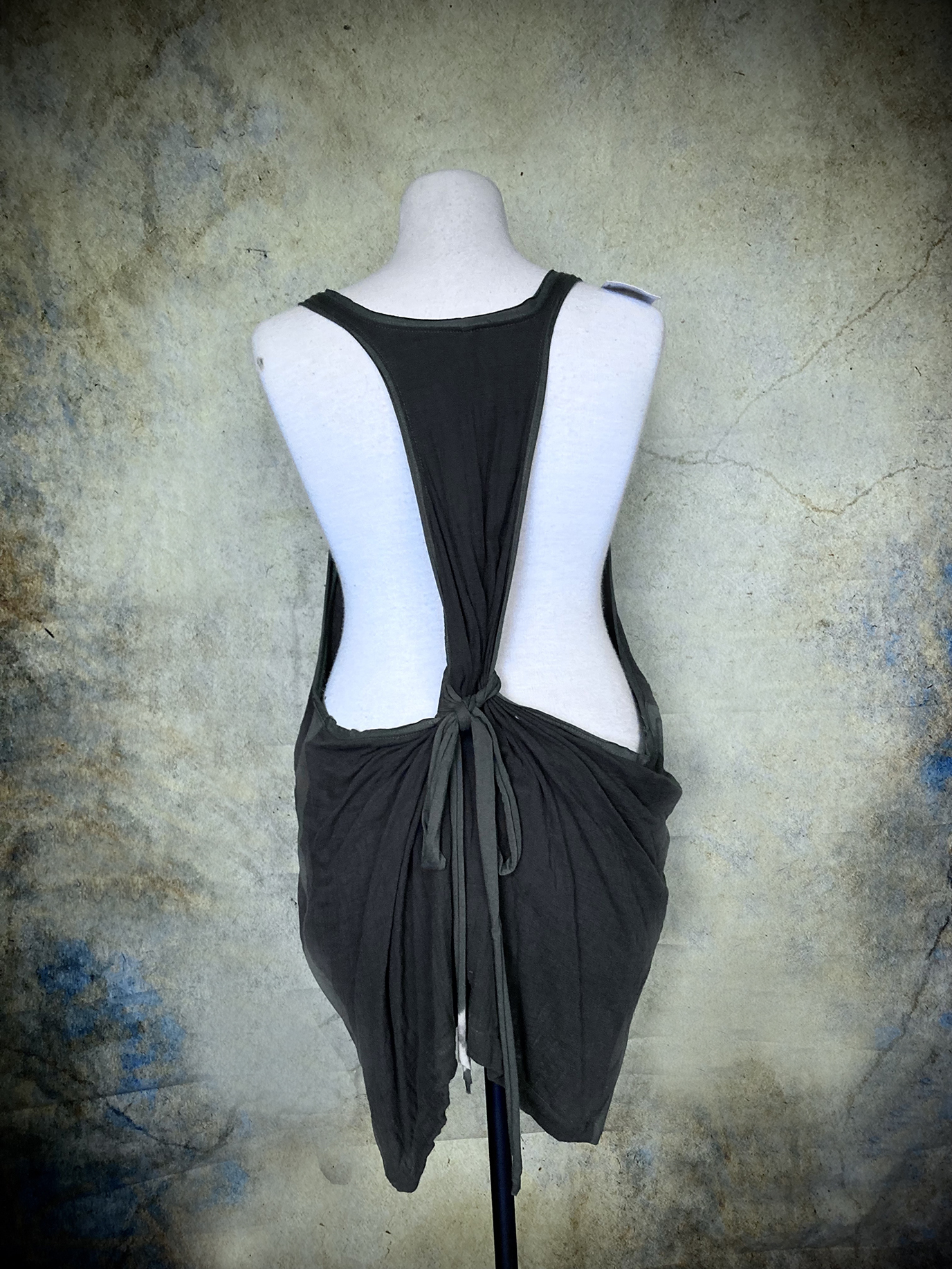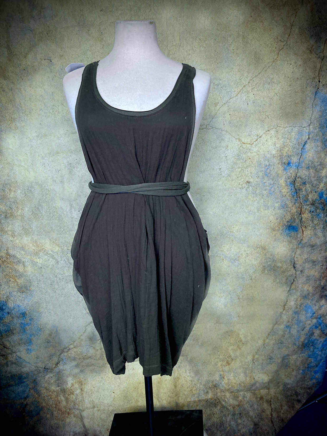 Made from comfortable armygreen cotton mesh and sage green jersey, this ‘sack dress’ can be worn in different ways by adjusting the strap that is attached to the back. The dress has a racerback and a ‘raw edge’ finished jersey binding at the sleeves and neckline.