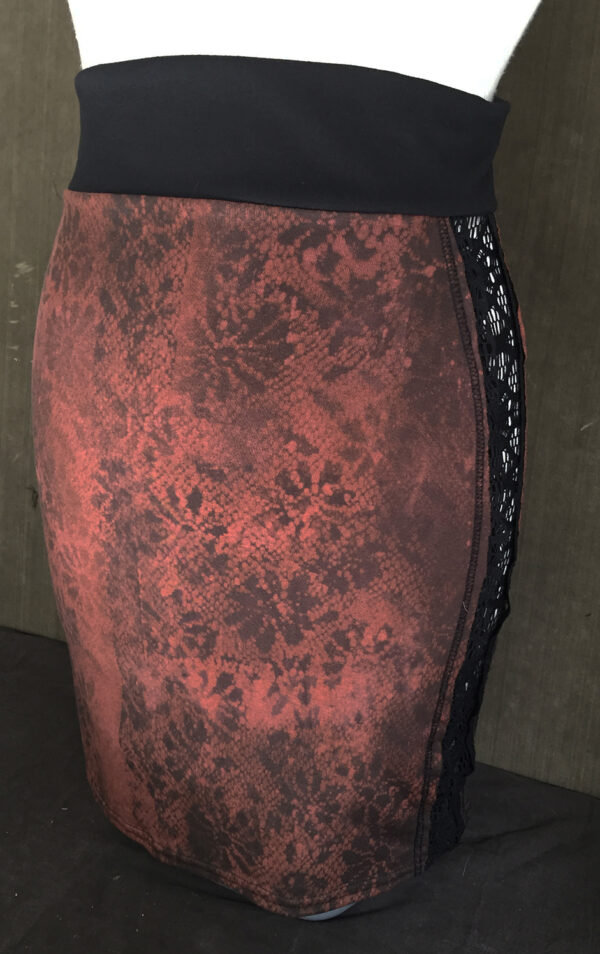 Comfortable handbleached jersey pencilskirt. The skirt has a soft wide waistband and black lace insets at the sides with raw unfinished edges.