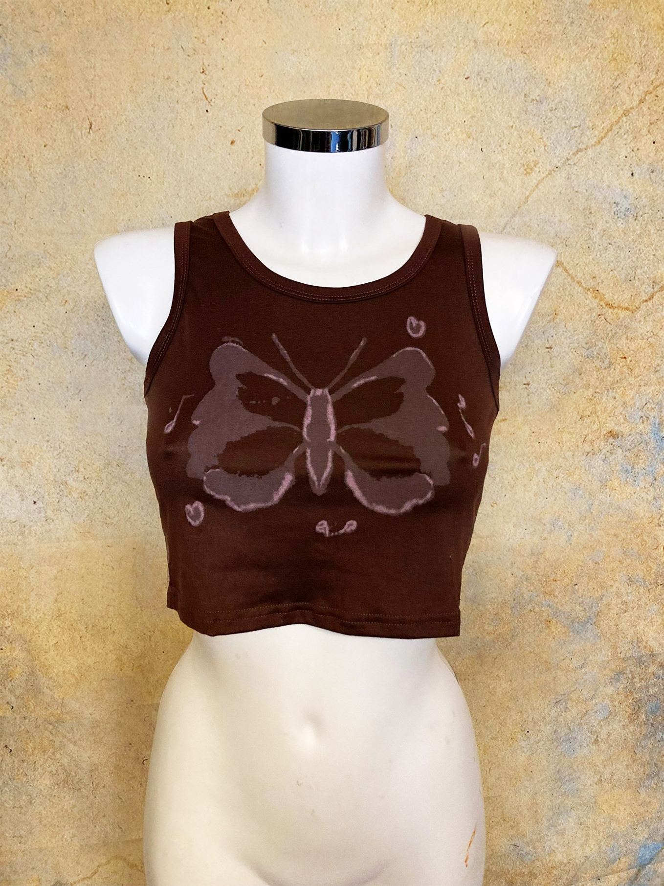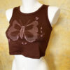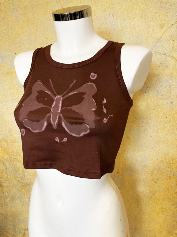 Comfortable, simple croptop made from synthetic fabric with ‘bleached’ butterfly at the front.