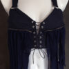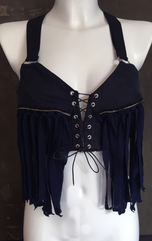 Made from blue cotton and jersey with tassles and zipper elements at the front cups.