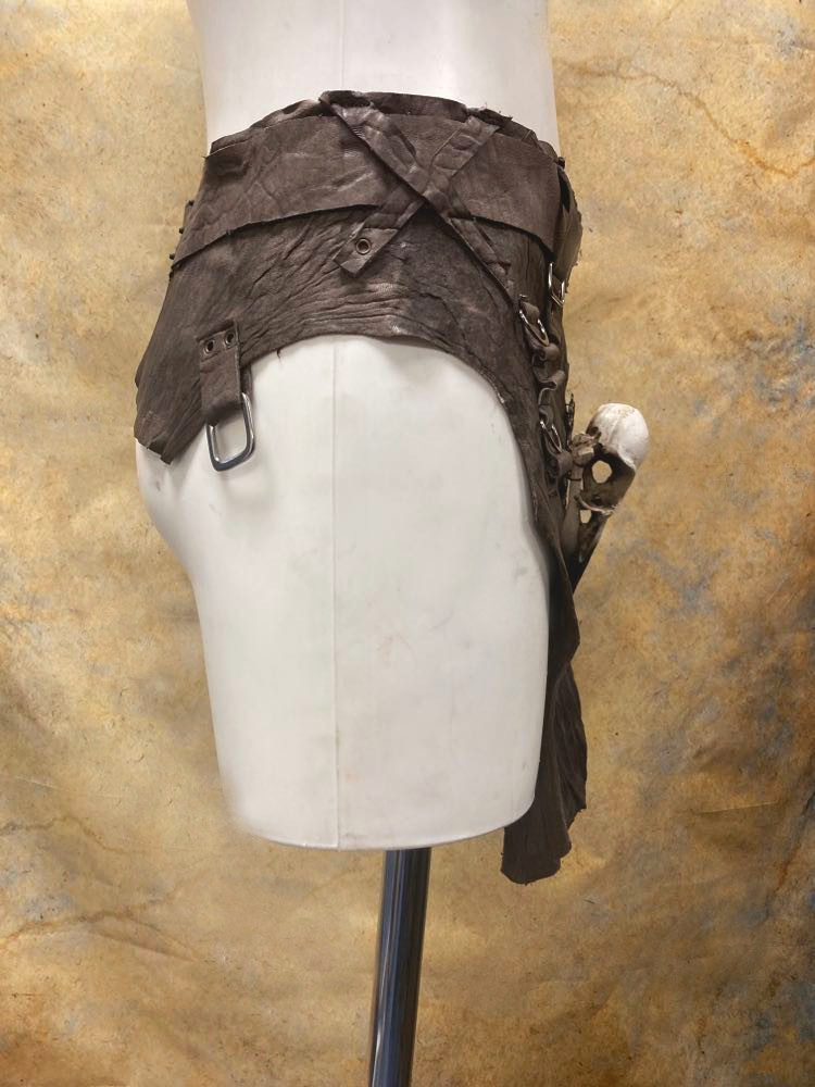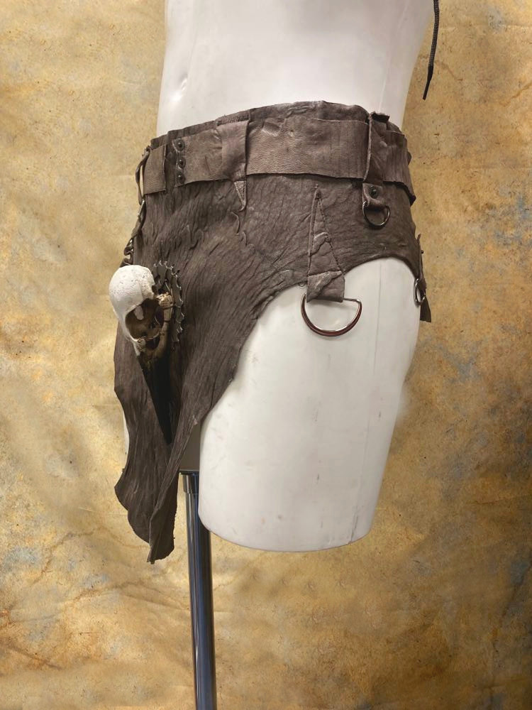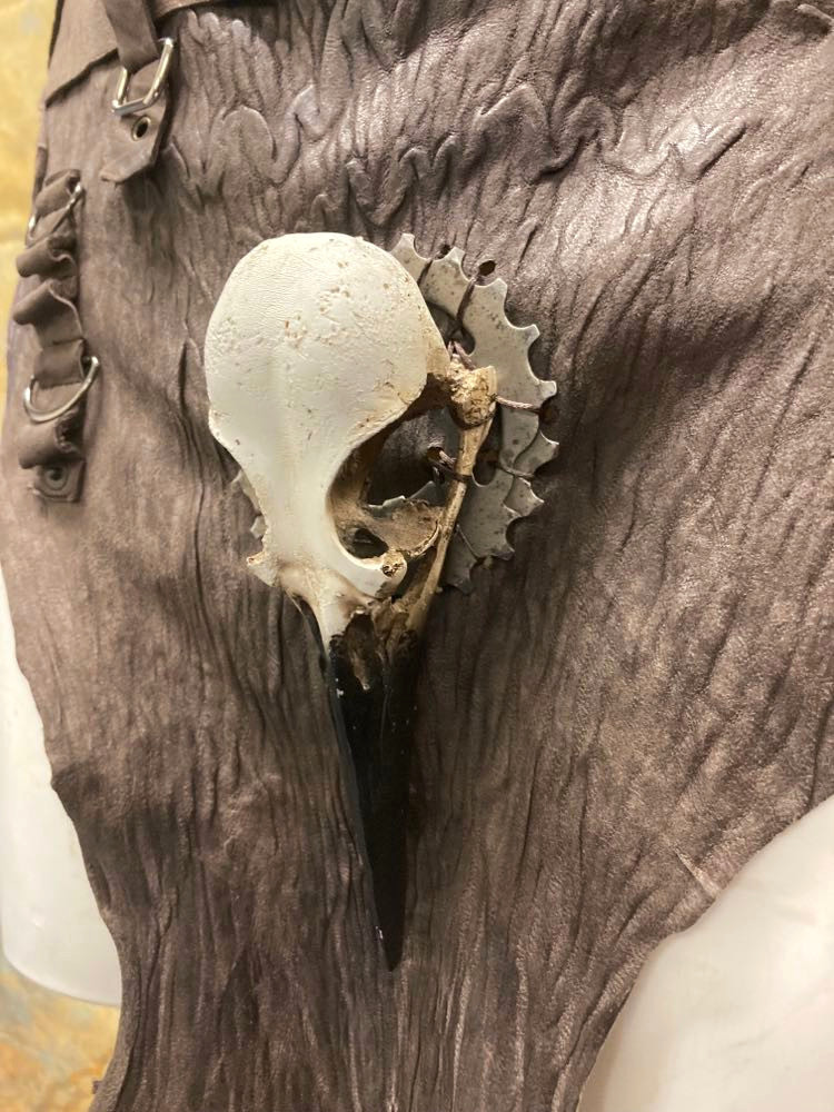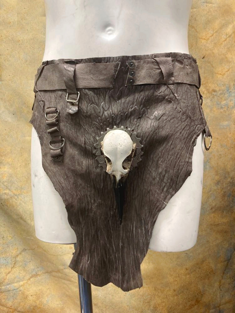 The obvious crowd pleaser is the center of the apron: A heavy resin birdscull attached to a metal cogwheel. It has loops, pockets and closes at the back with a belted strap.