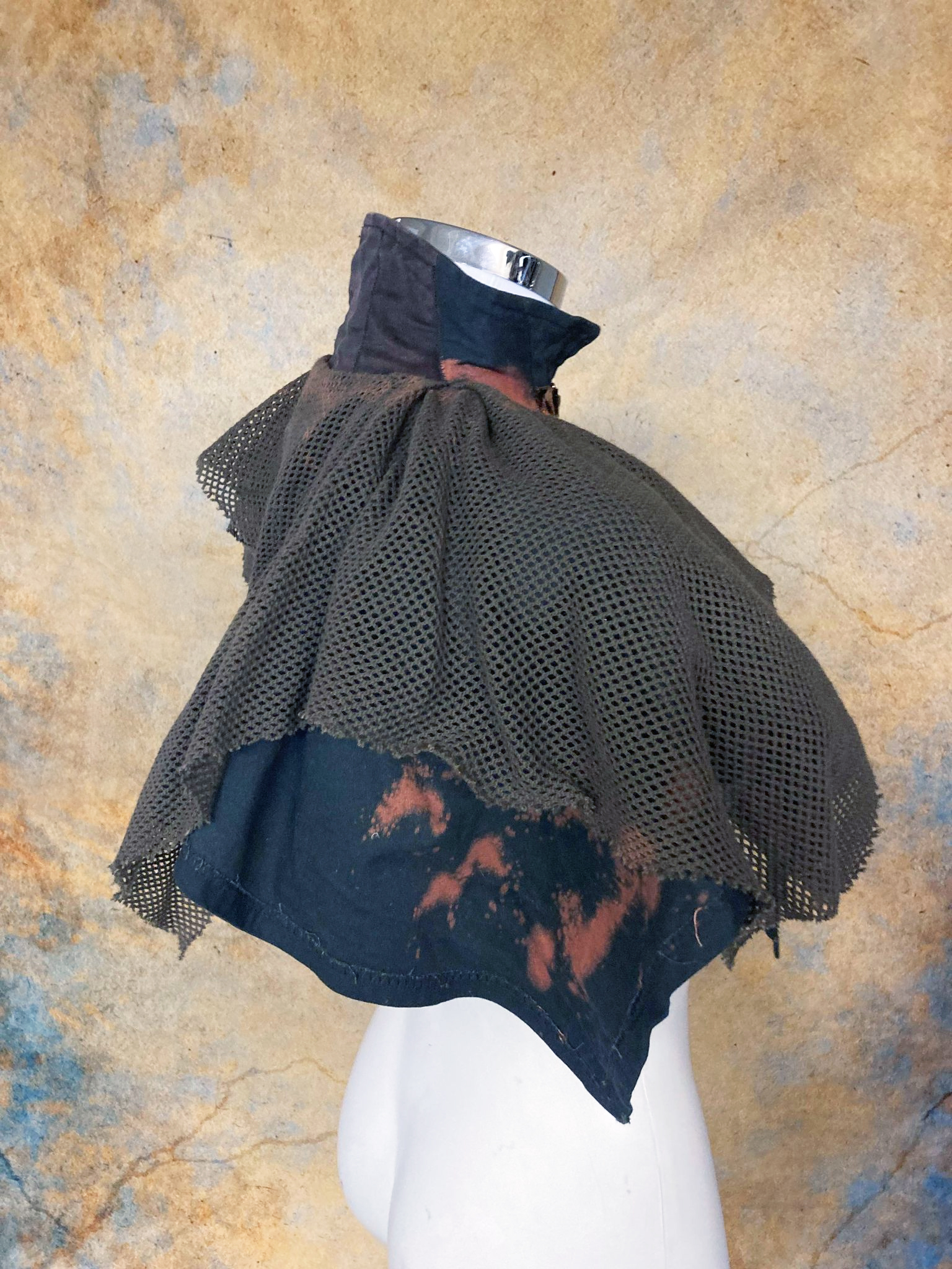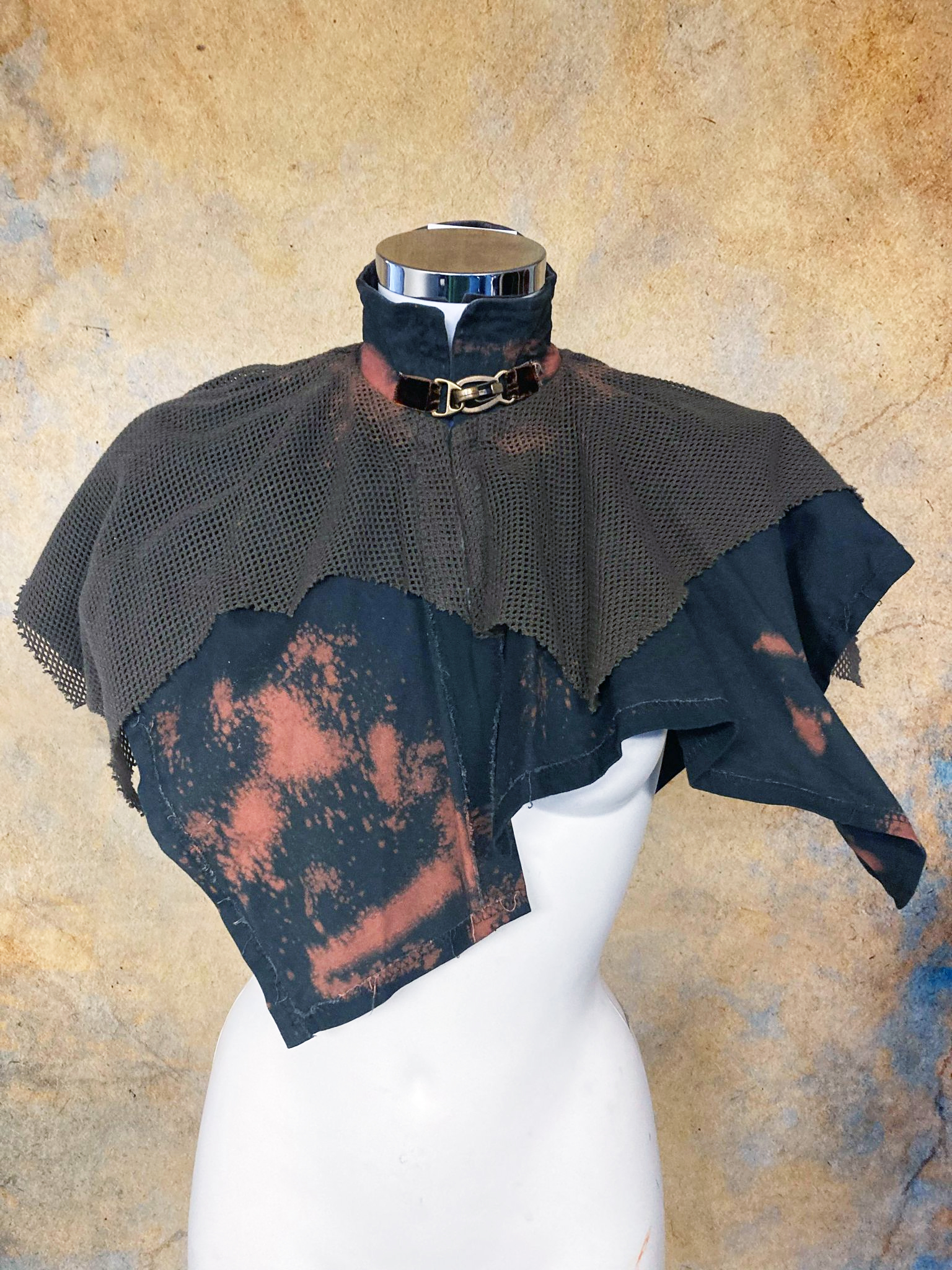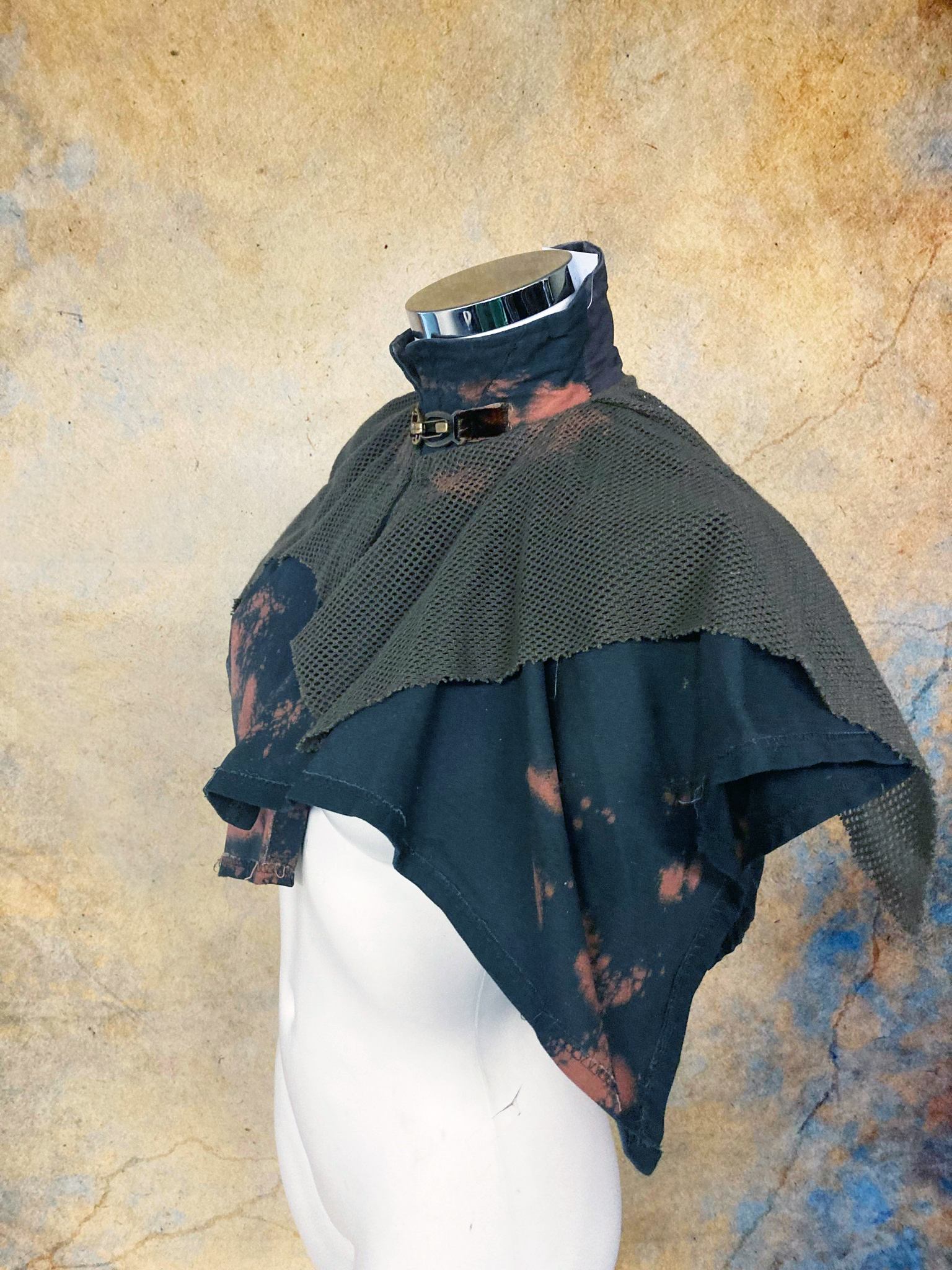 Elegant capelet Wastelander style! For that one special evening… A-symmetrical capelet made from weathered and handbleached greyblue cotton and soft green cotton mesh. The item has an elegant, high necked collar and flares out from to a very wide bottom from the shoulders down.