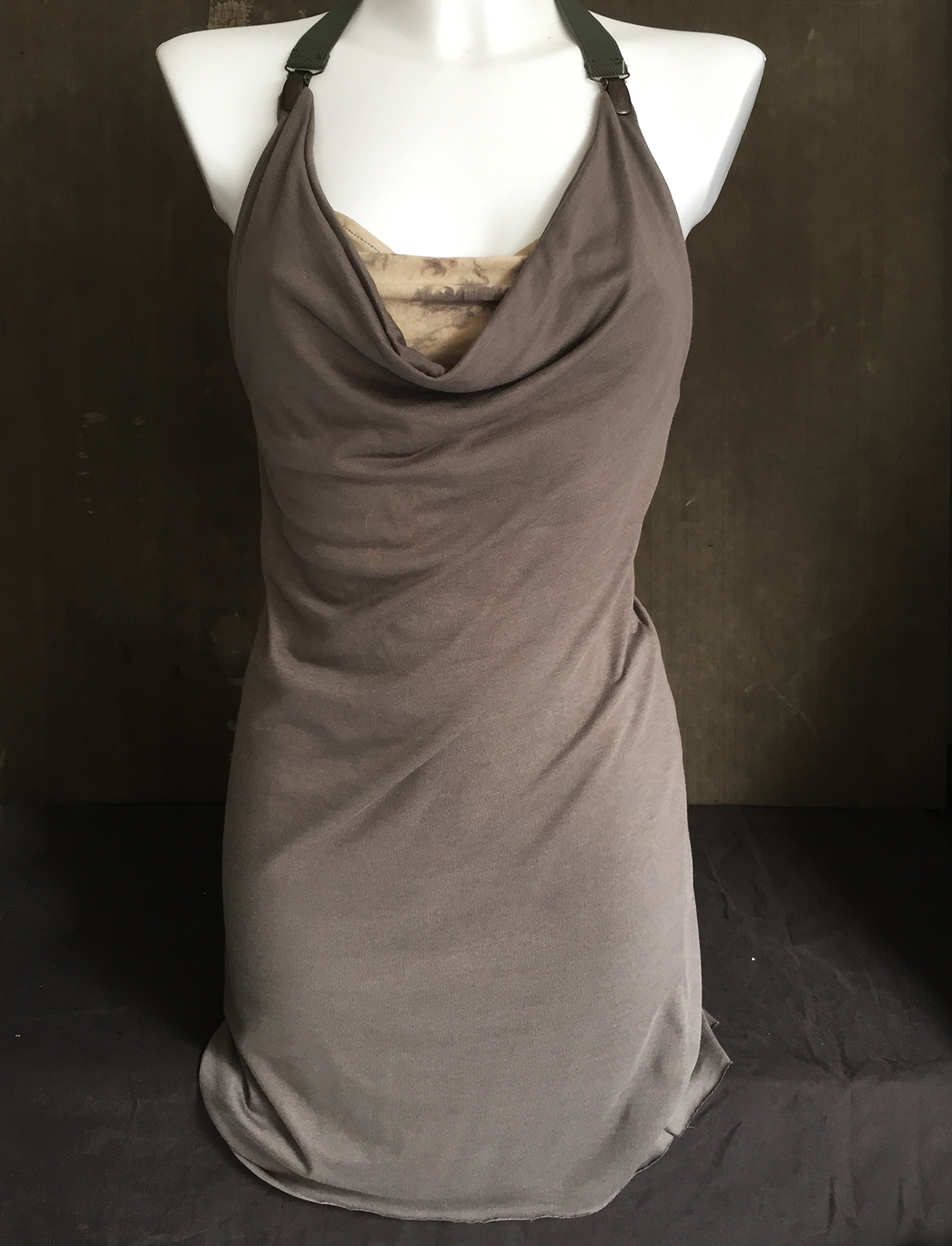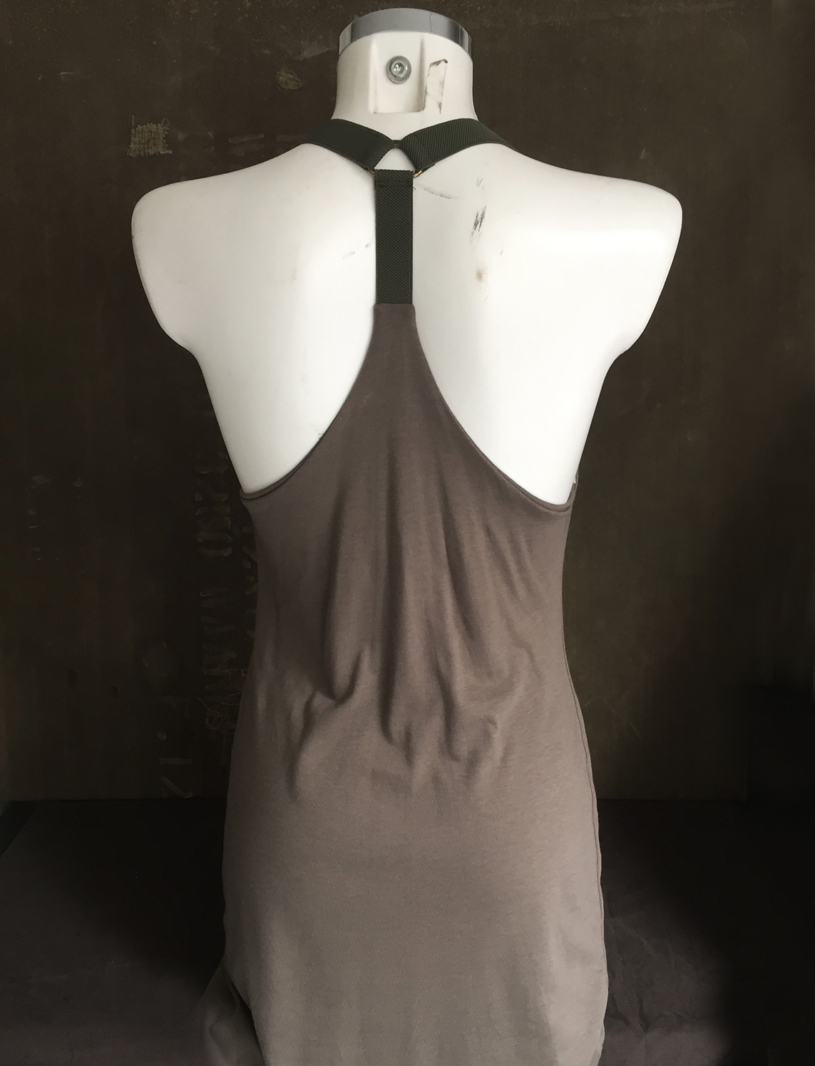 Has a draped neckline with salopette clasps and elastic straps that end at the back in a racerpback neckline.