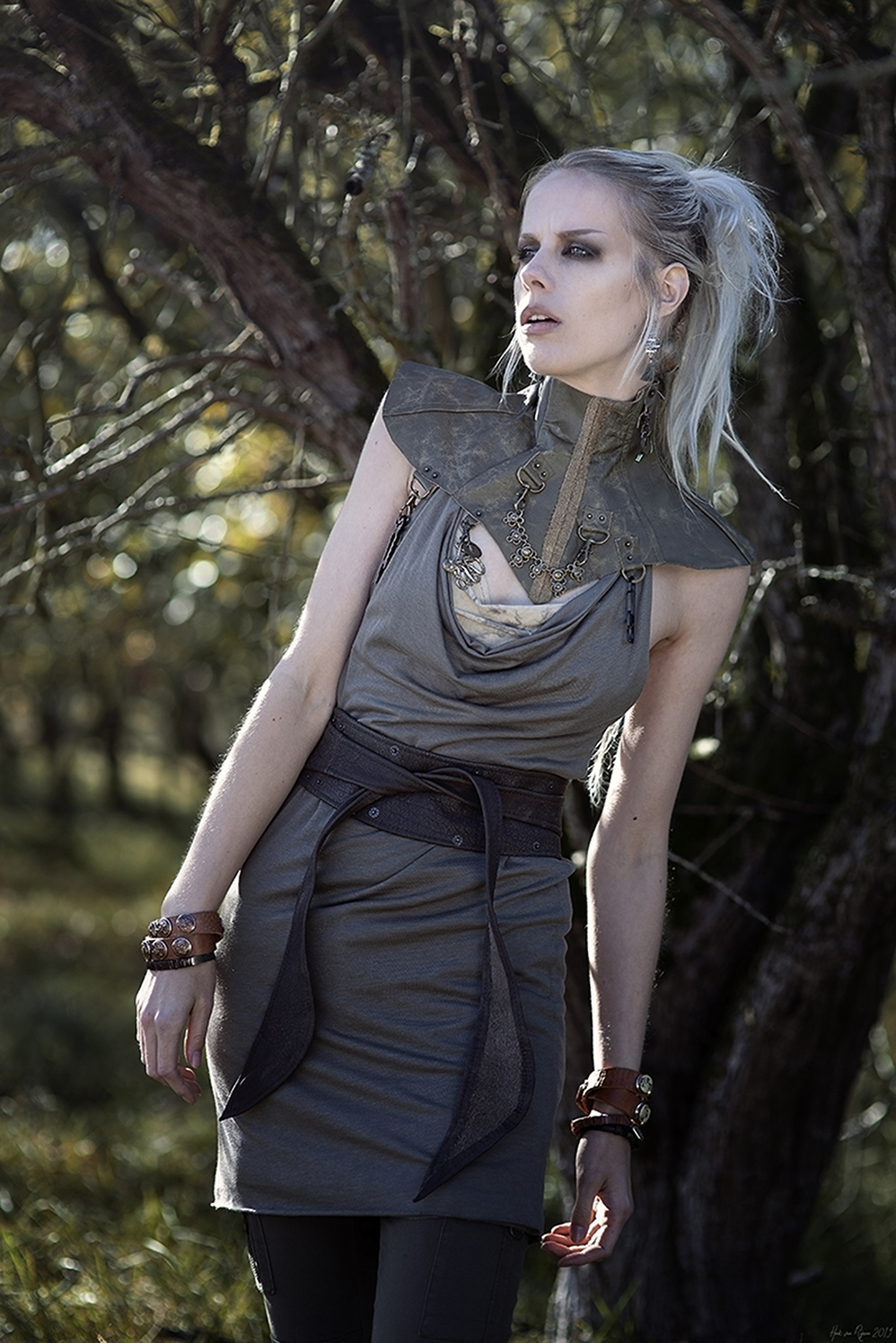 The dress has a deliberately unfinished hemline and vents with rounded hem at the sides.