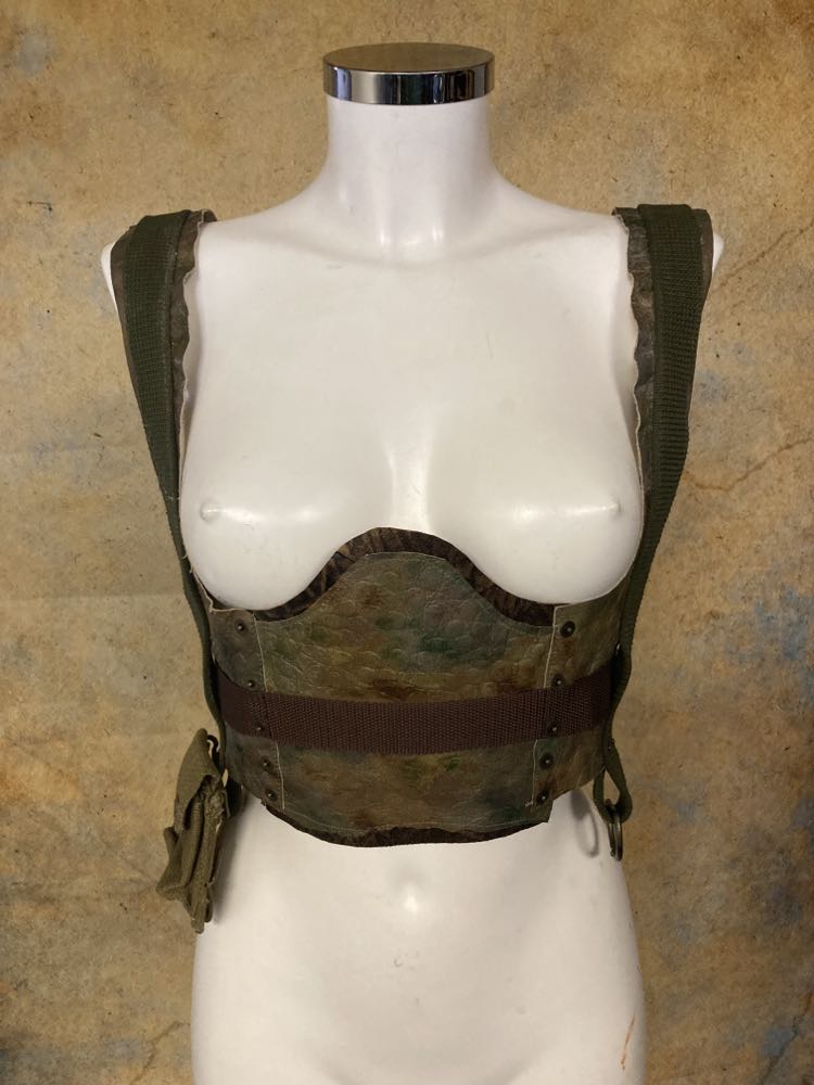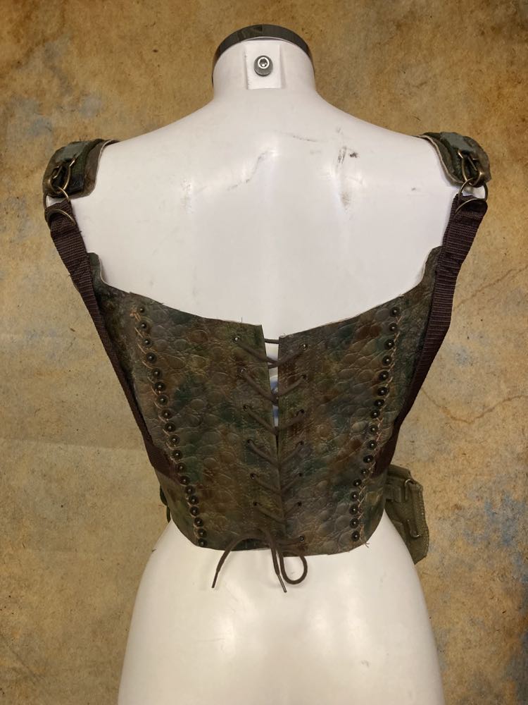 Underbust harness made from mottled greenbrown leather with a crocodile relief imprinted on it. The harness laces in the back with a corset-like closure, so its size is somewhat fluid. This item has shoulderstraps and a little pocket made from military equipment. Its parts are attached with rivets and decorated with handstitching.