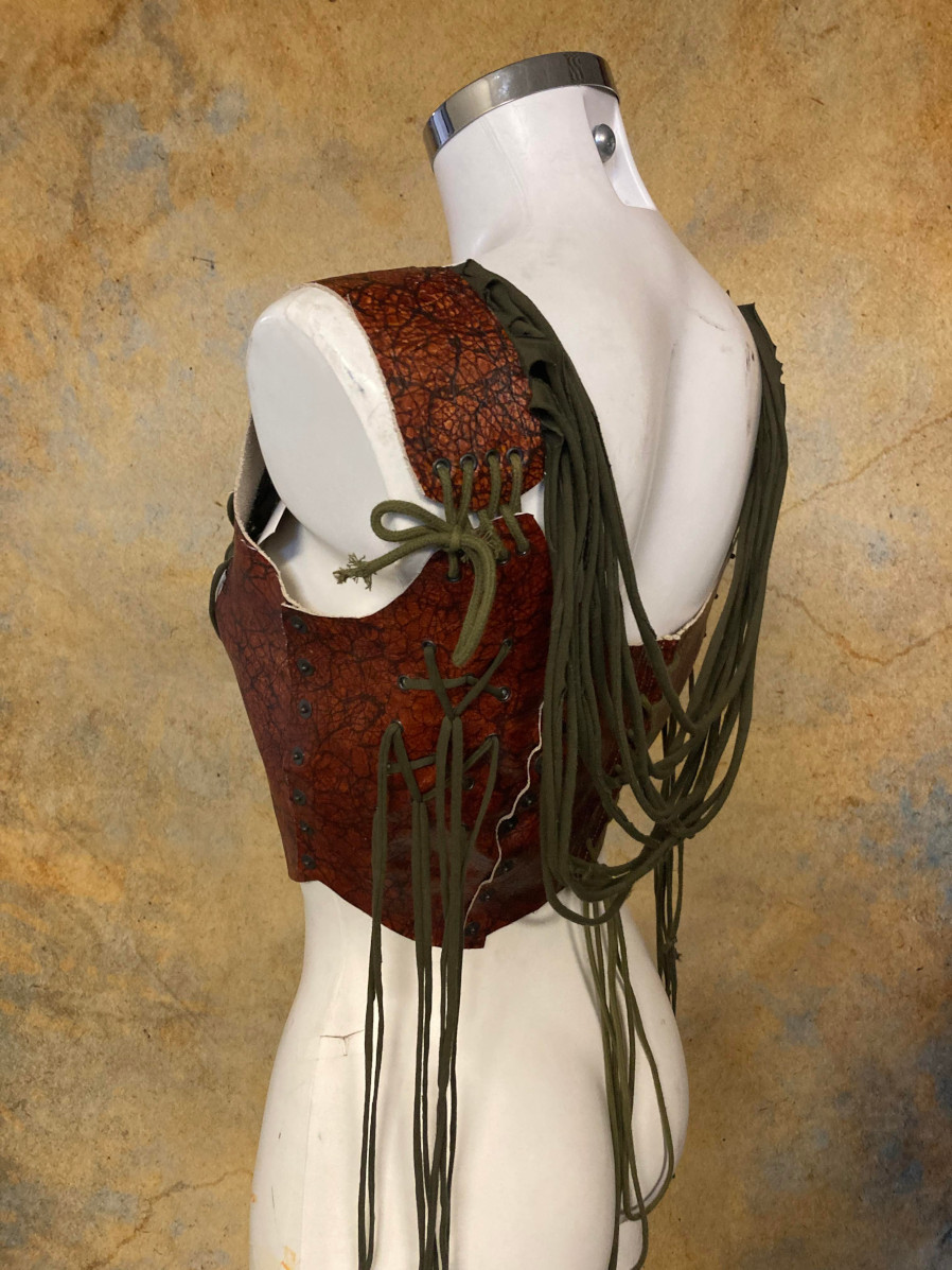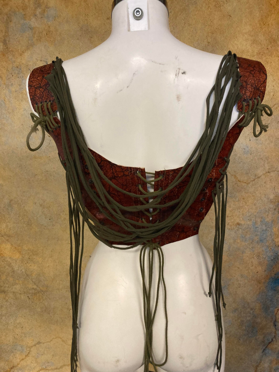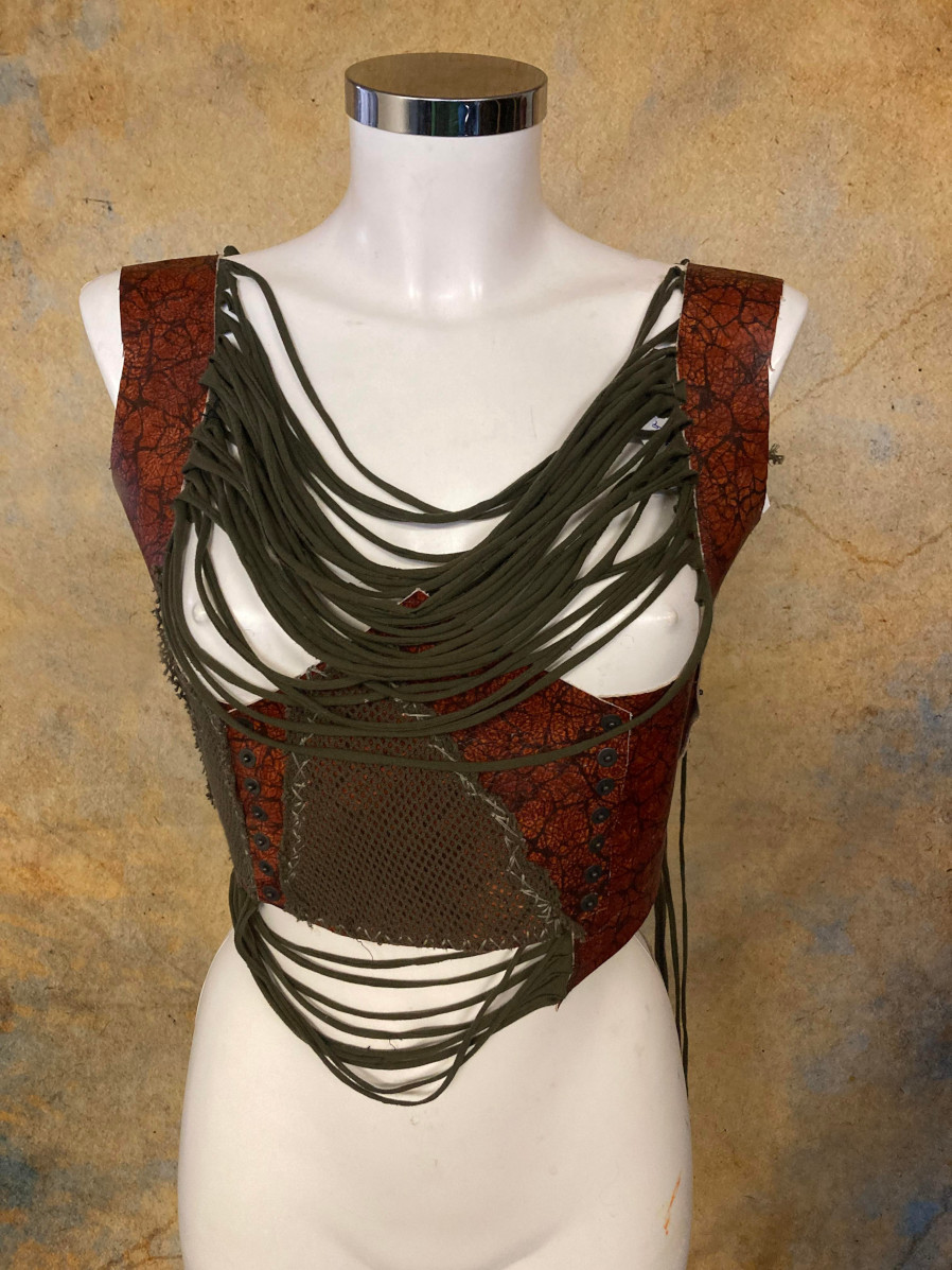 Underbust harness made from veined rustbrown leather. The harness laces in the back with a corset-like closure, so its size is somewhat fluid. This item is decorated with jersey straps and tassles and green mesh. Its parts are attached with rivets and decorated with handstitching.