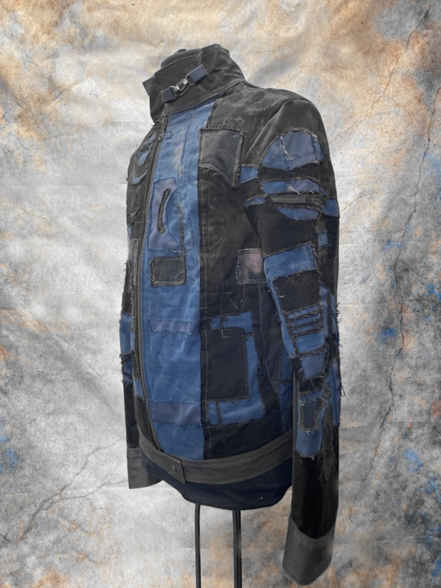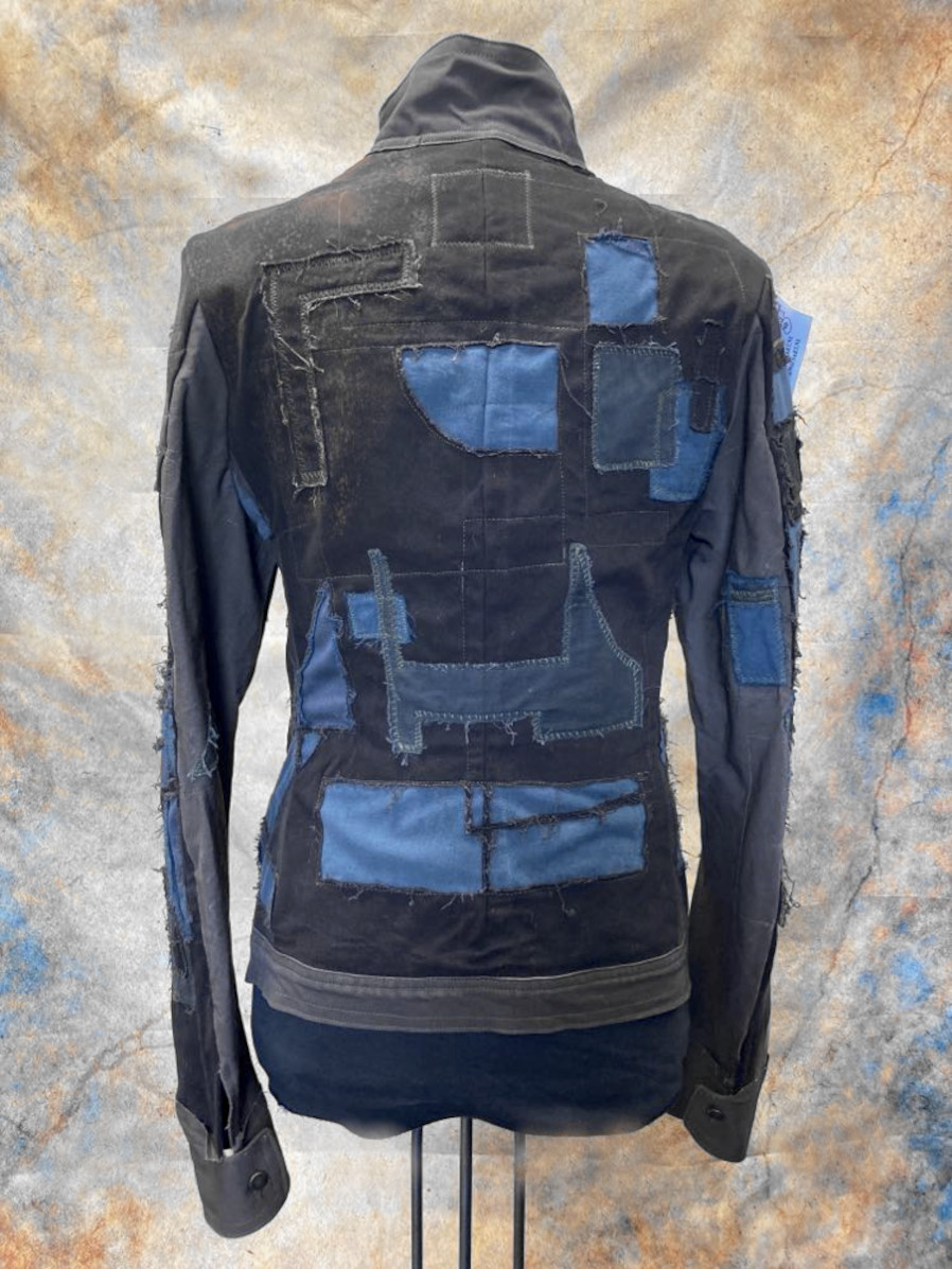 Stunning long sleeved jacket with a high standing collar made from many different kinds of reclaimed cotton. The Ares is made from many layers of cotton with cutouts and stitching all over.