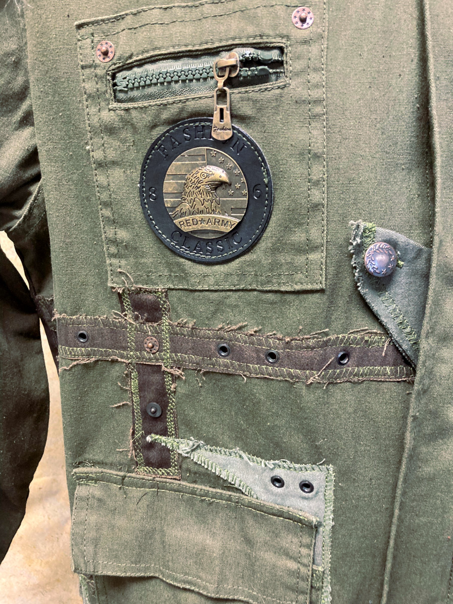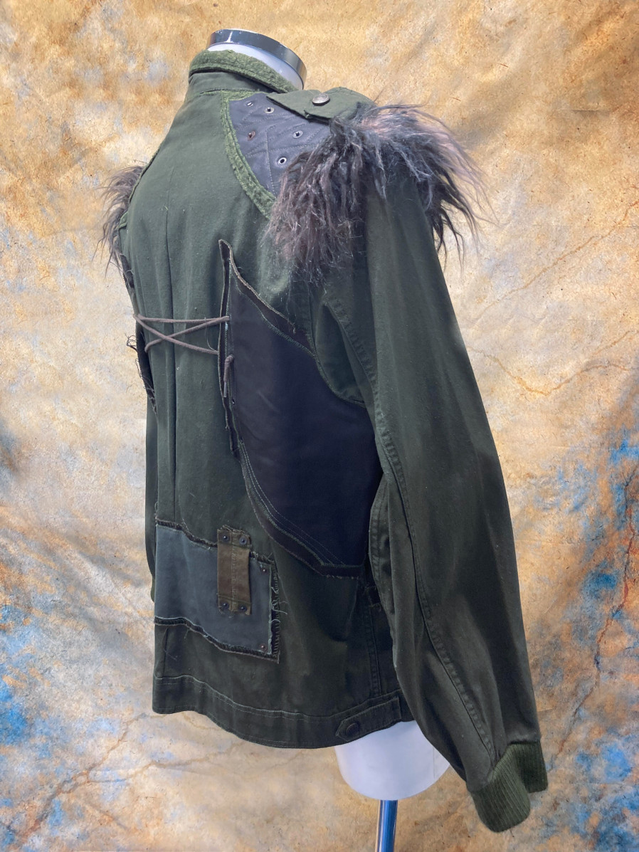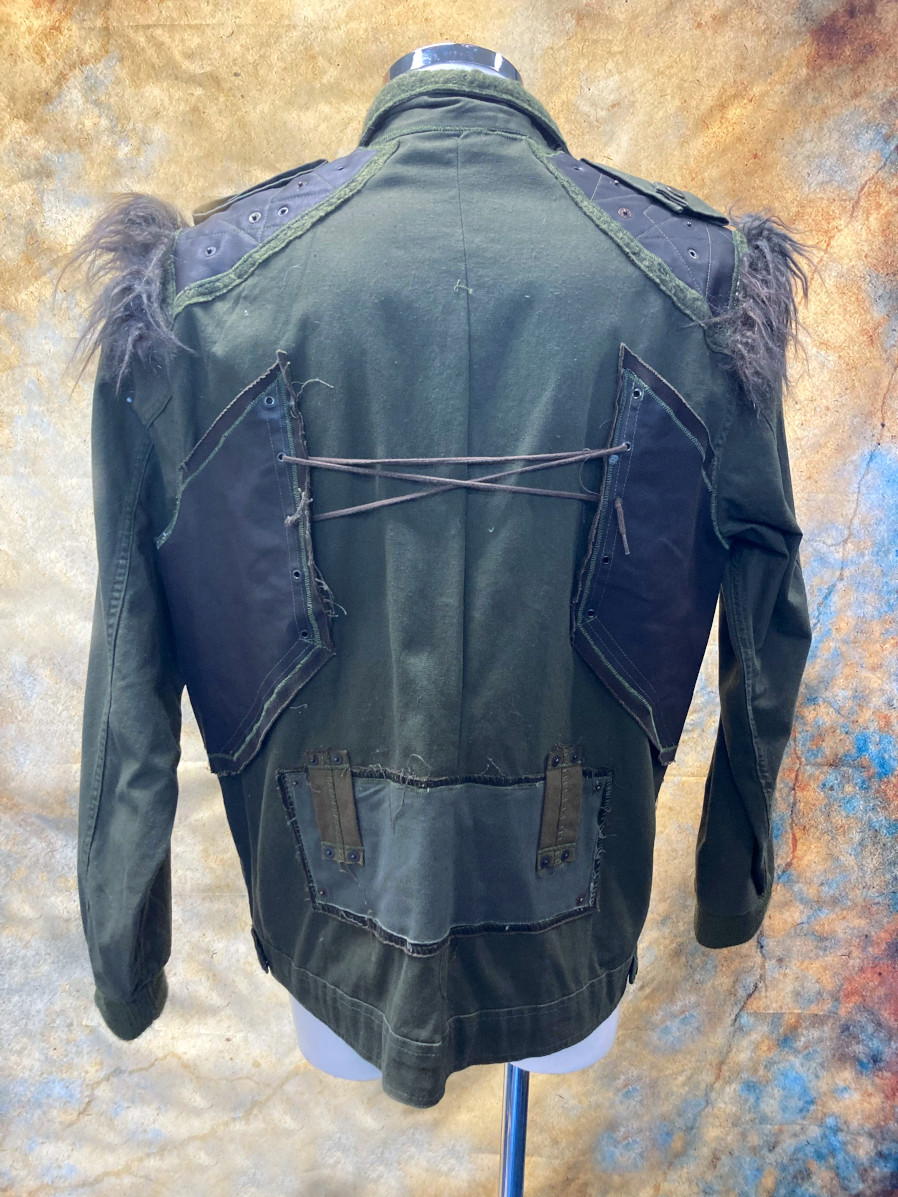 Military style jacket made from very sturdy cotton twill, feaux fur, feaux leather and several other materials for decoration.