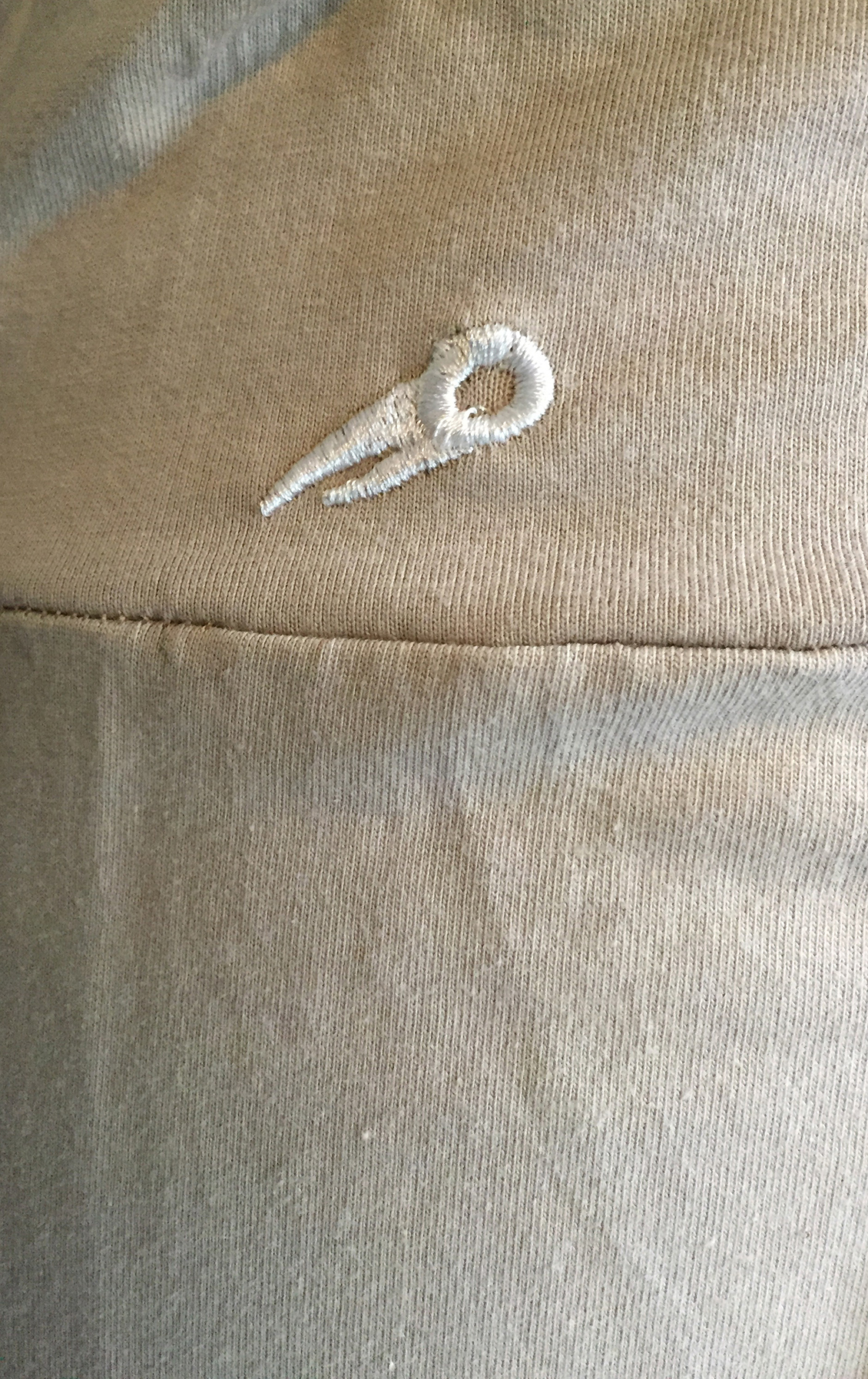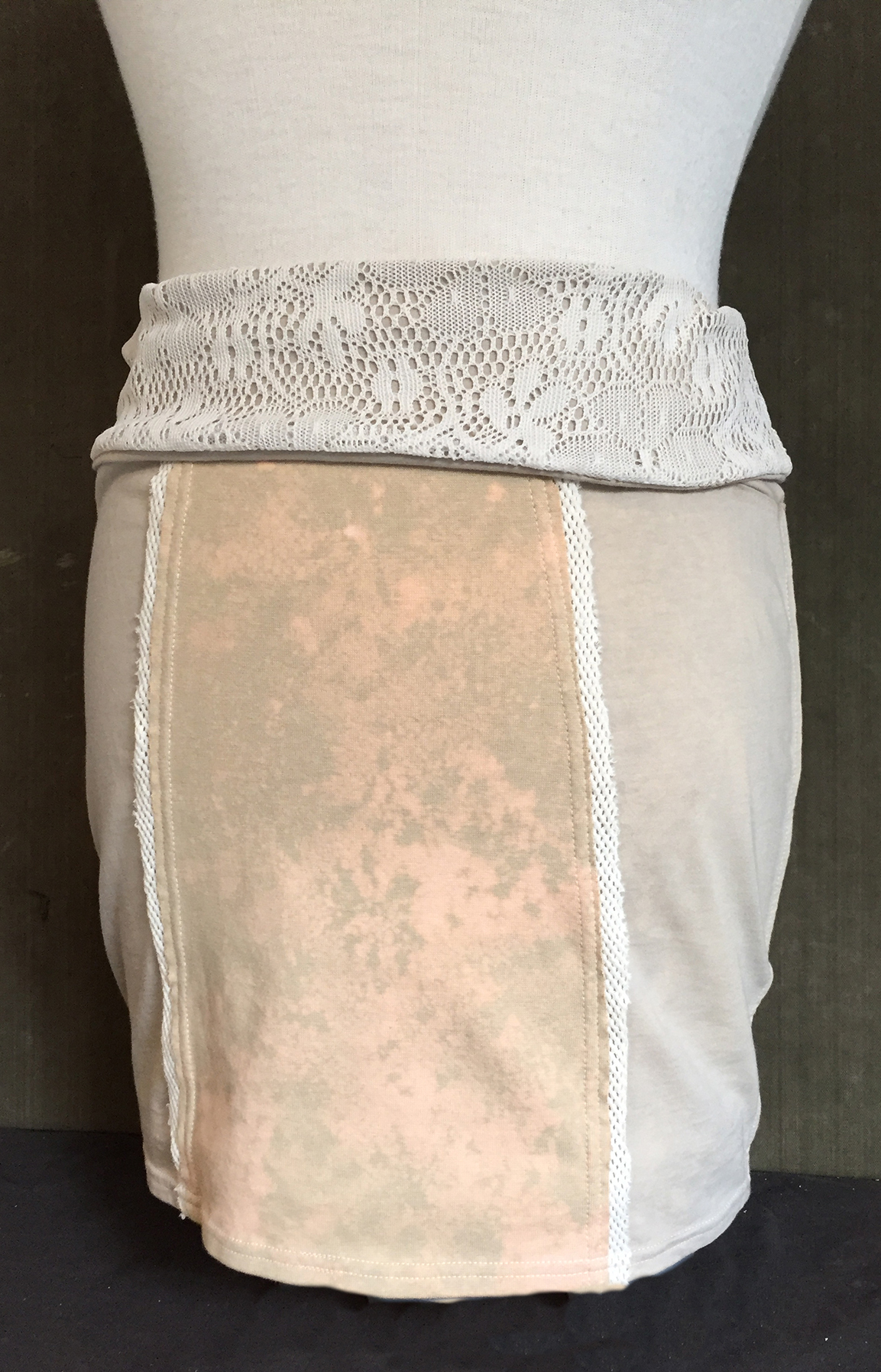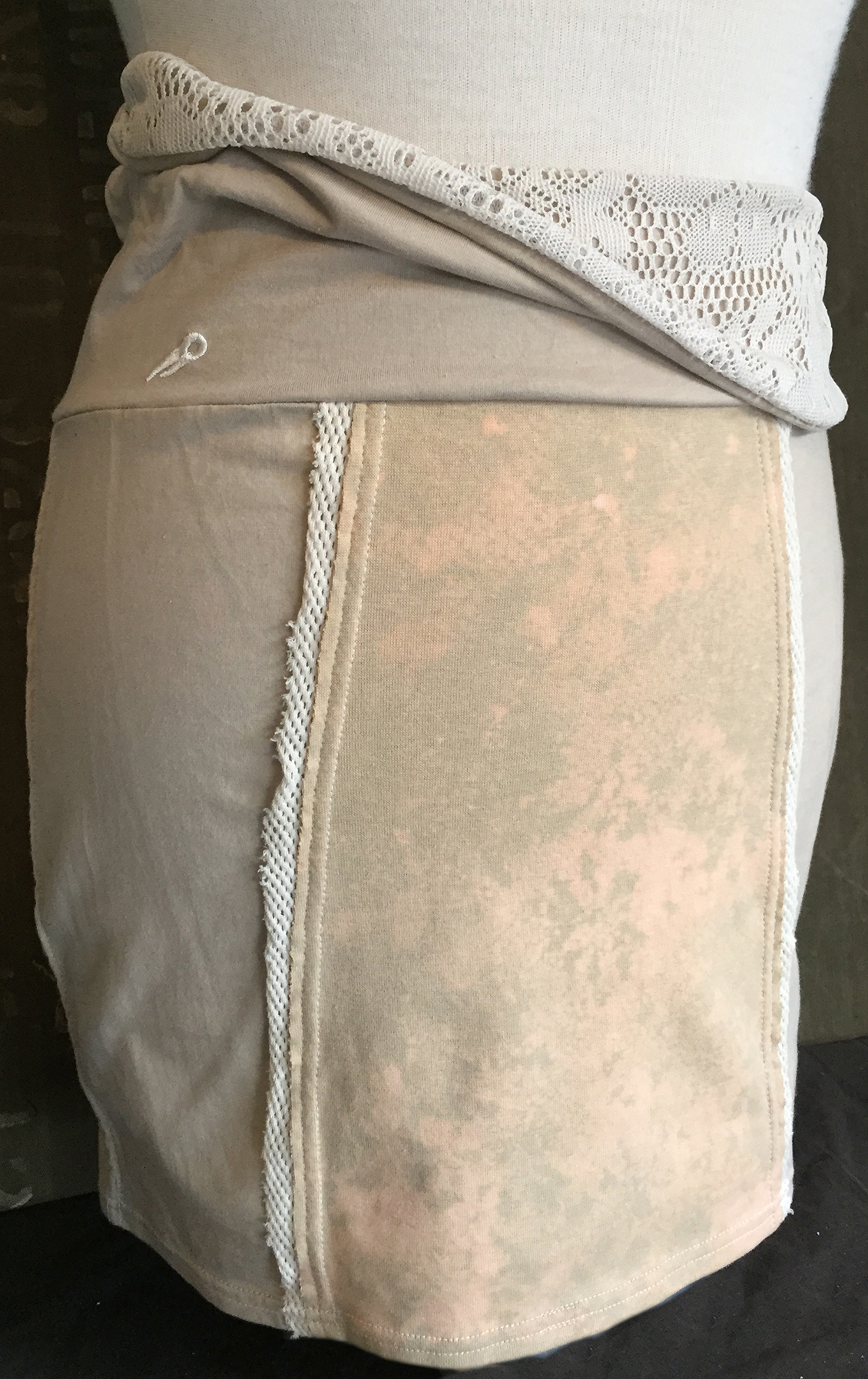 The skirt has been hand-bleached and has deliberate frayed decorations along the seams. It has a very high elastic waistband with a scull embroidery that is supposed to be folded over for a more relaxed look, making its lace insides visible.