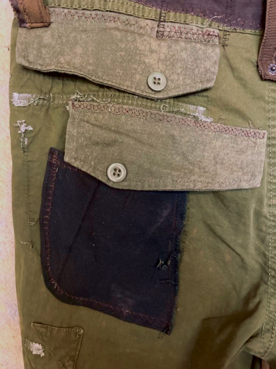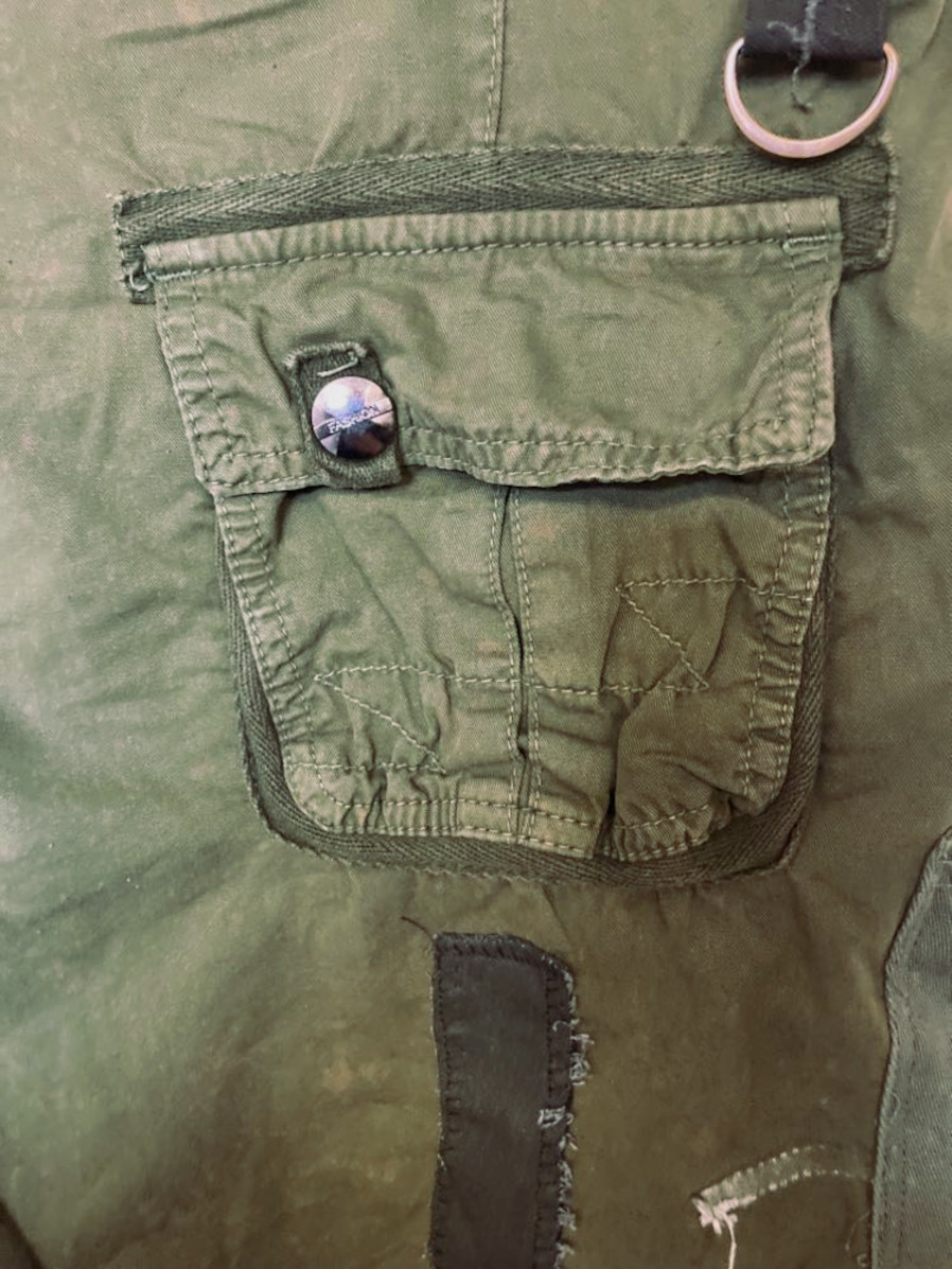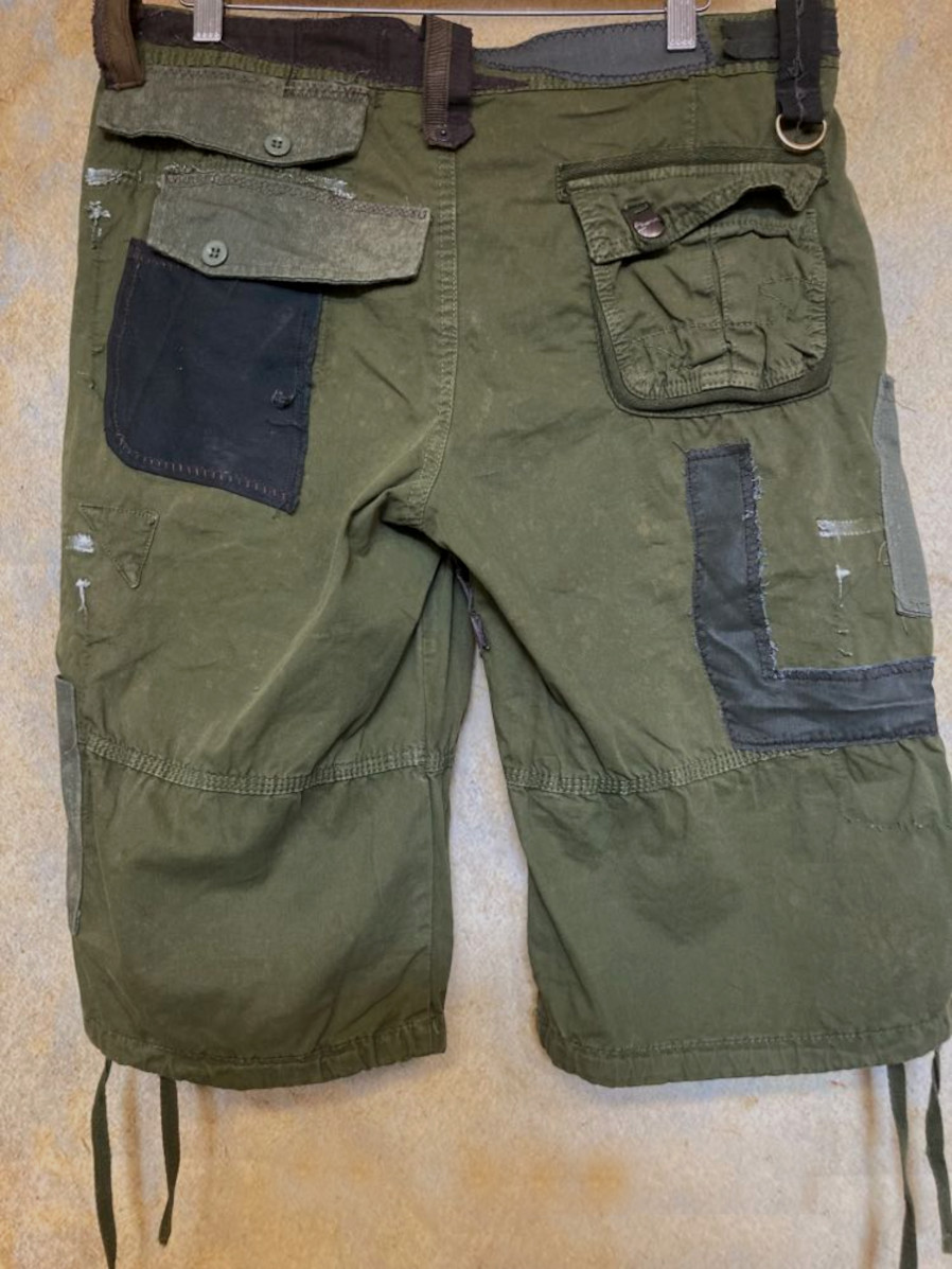 Simple, comfortable cargo shorts made from green cotton, a patchwork of stitched on reclaimed fabrics and many assorted pockets.