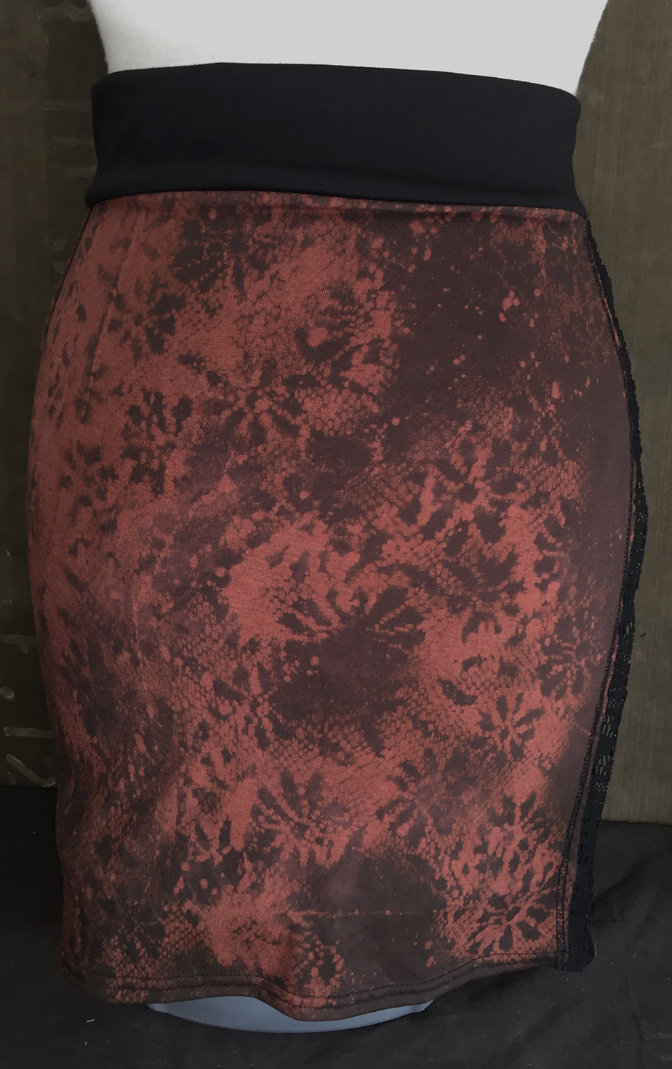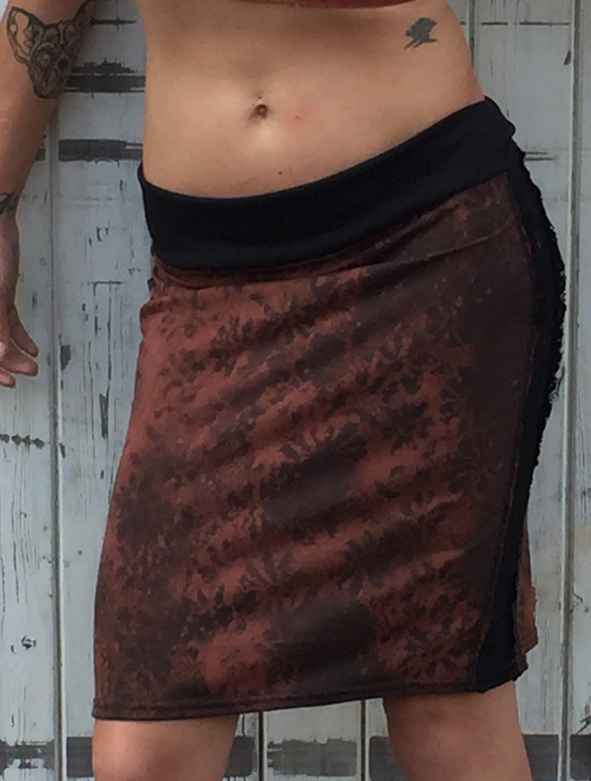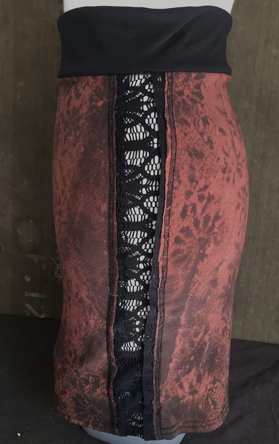 Comfortable handbleached jersey pencilskirt. The skirt has a soft wide waistband and black lace insets at the sides with raw unfinished edges.