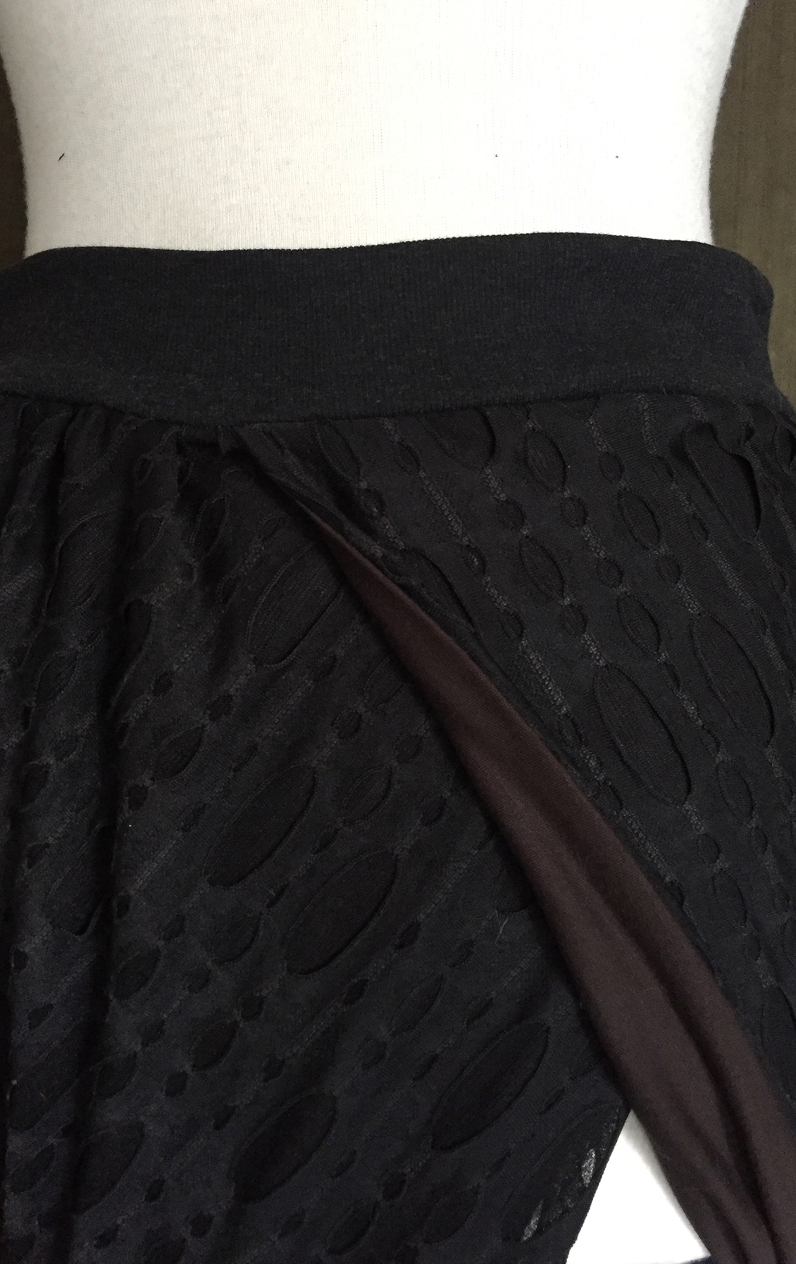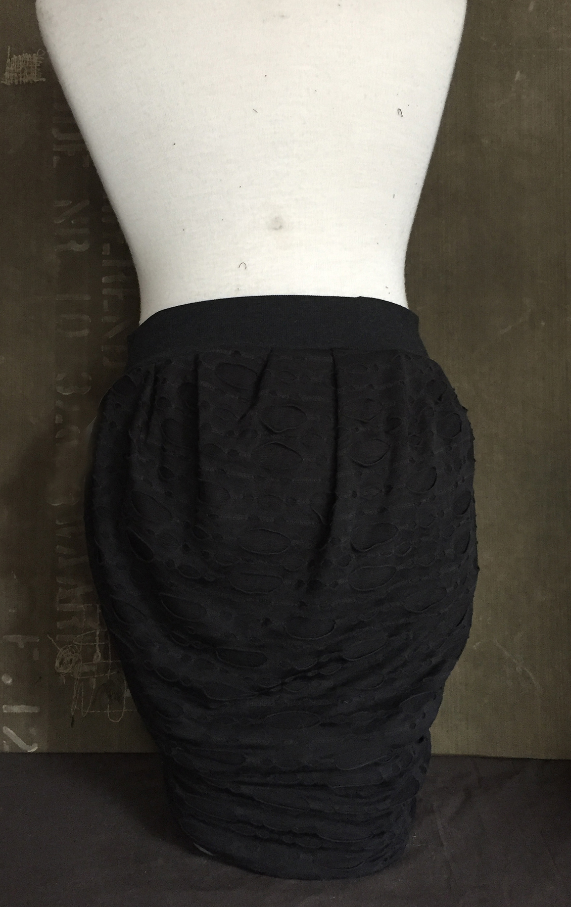 Draped ‘Flowerpetalskirt’ made from structured black nylon and brown cotton jersey.