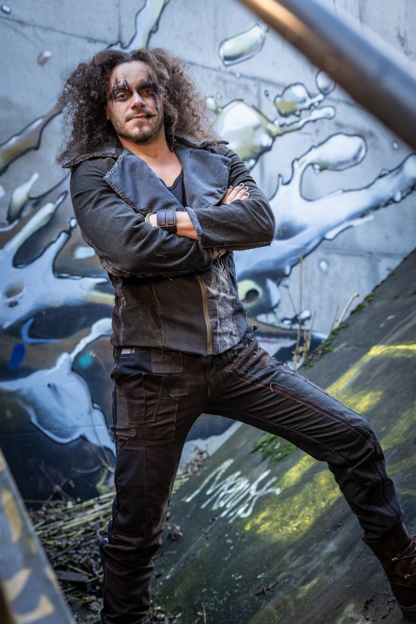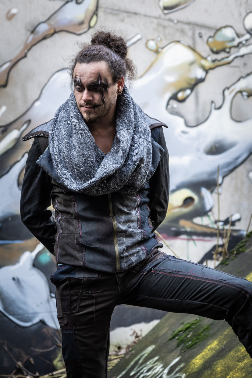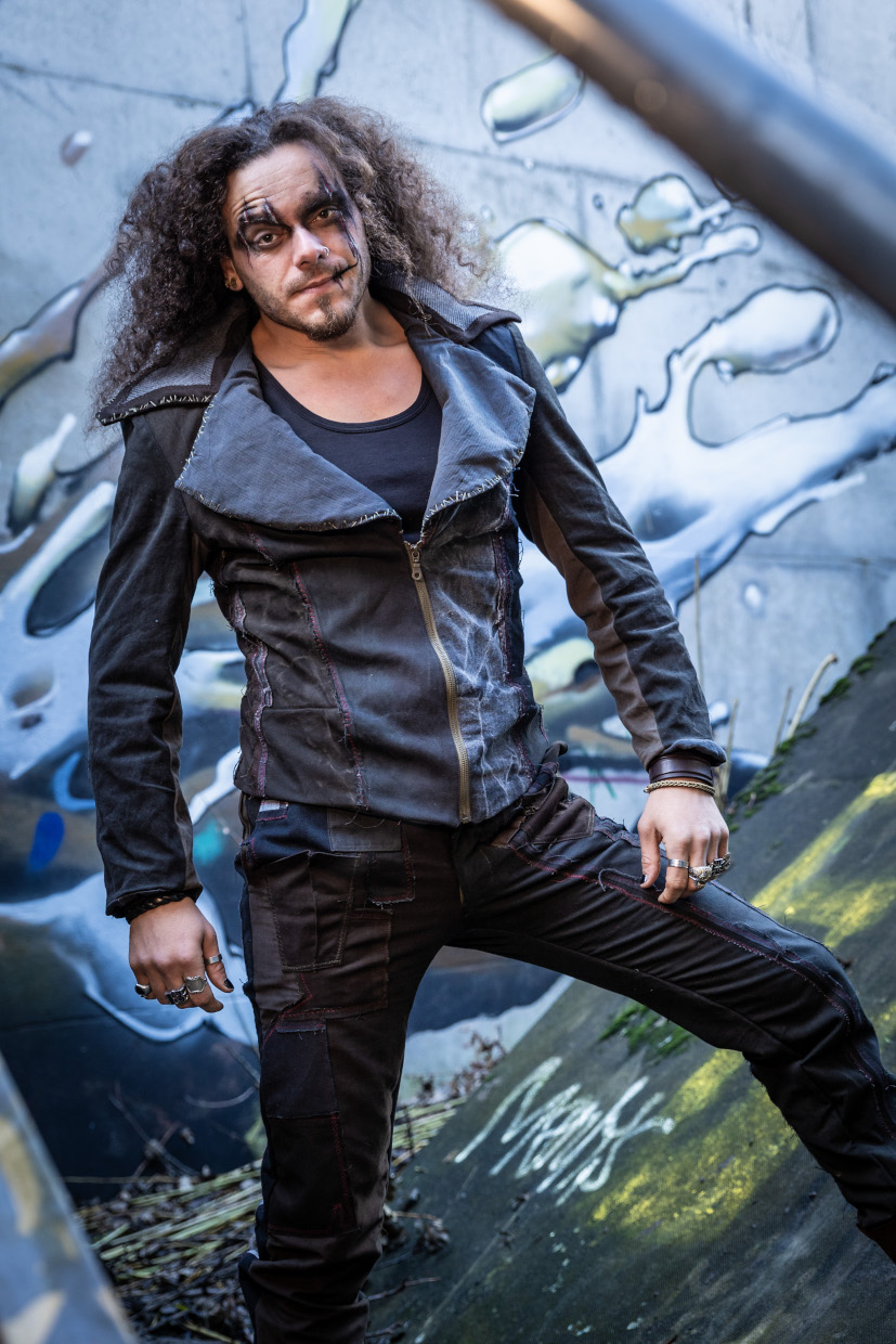 Stunning ‘suit-like’ jacket. Fully lined, made from piecemeal reclaimed fabrics with a very wide dramatic collar.