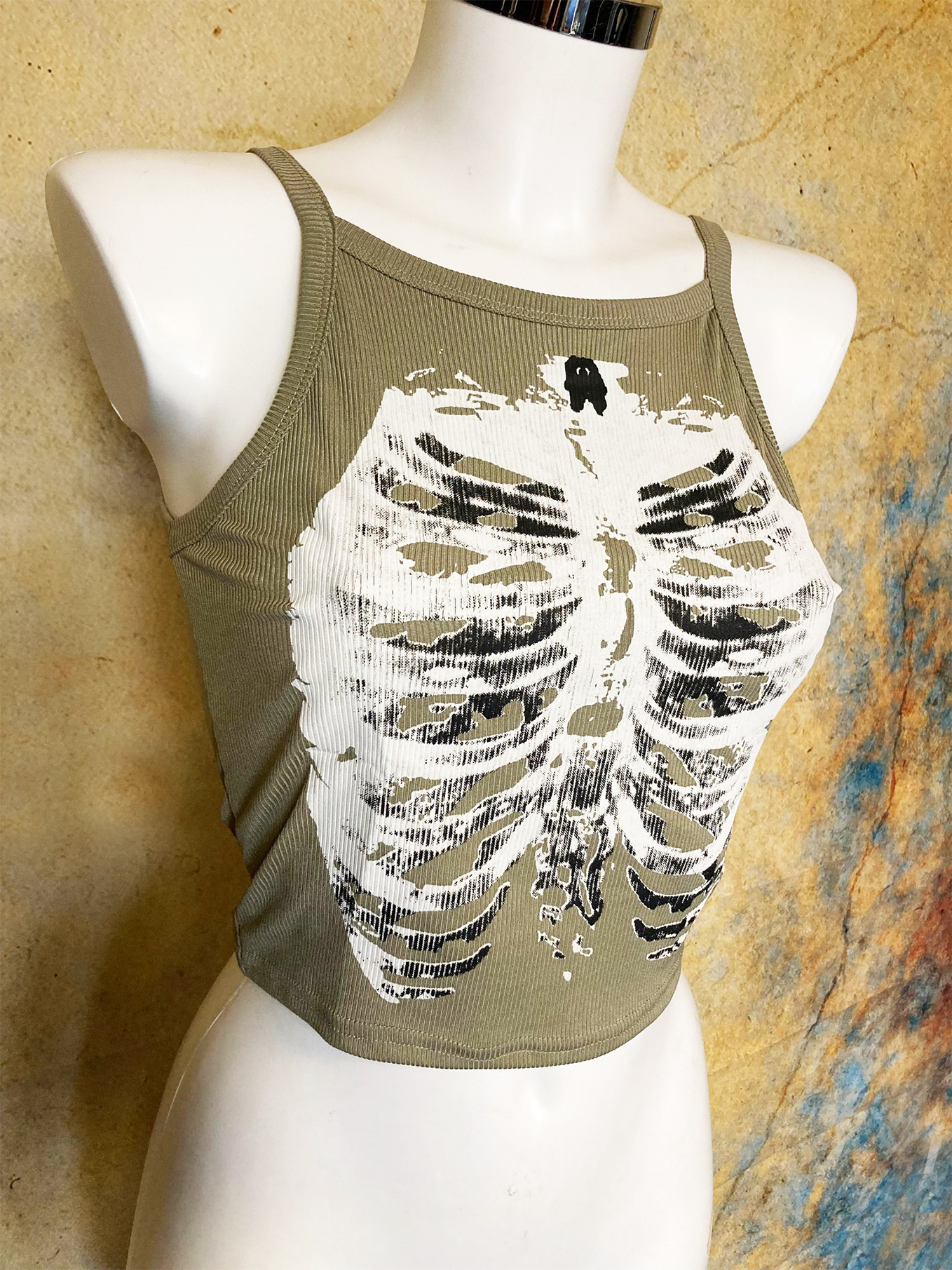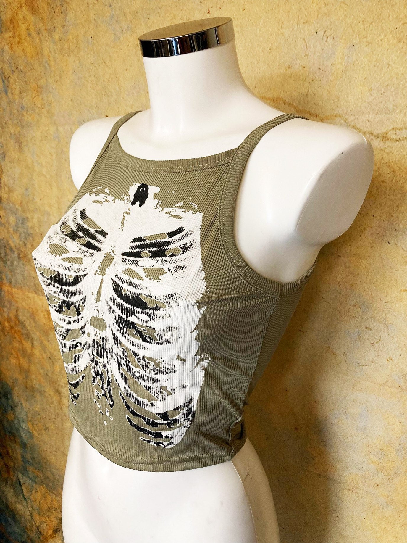 Comfortable beige ribbed cotton croptop with a ribcage print at the chest.