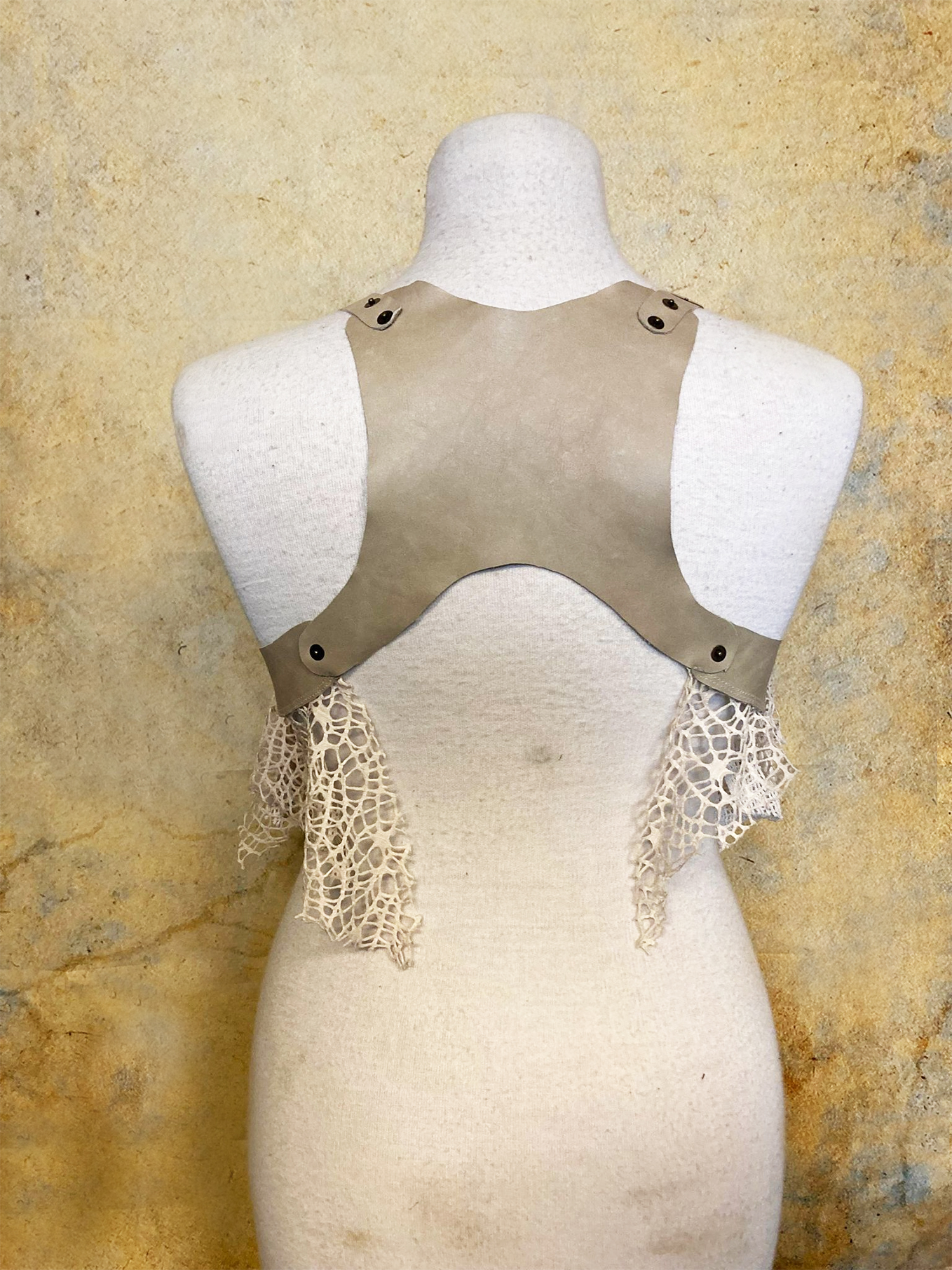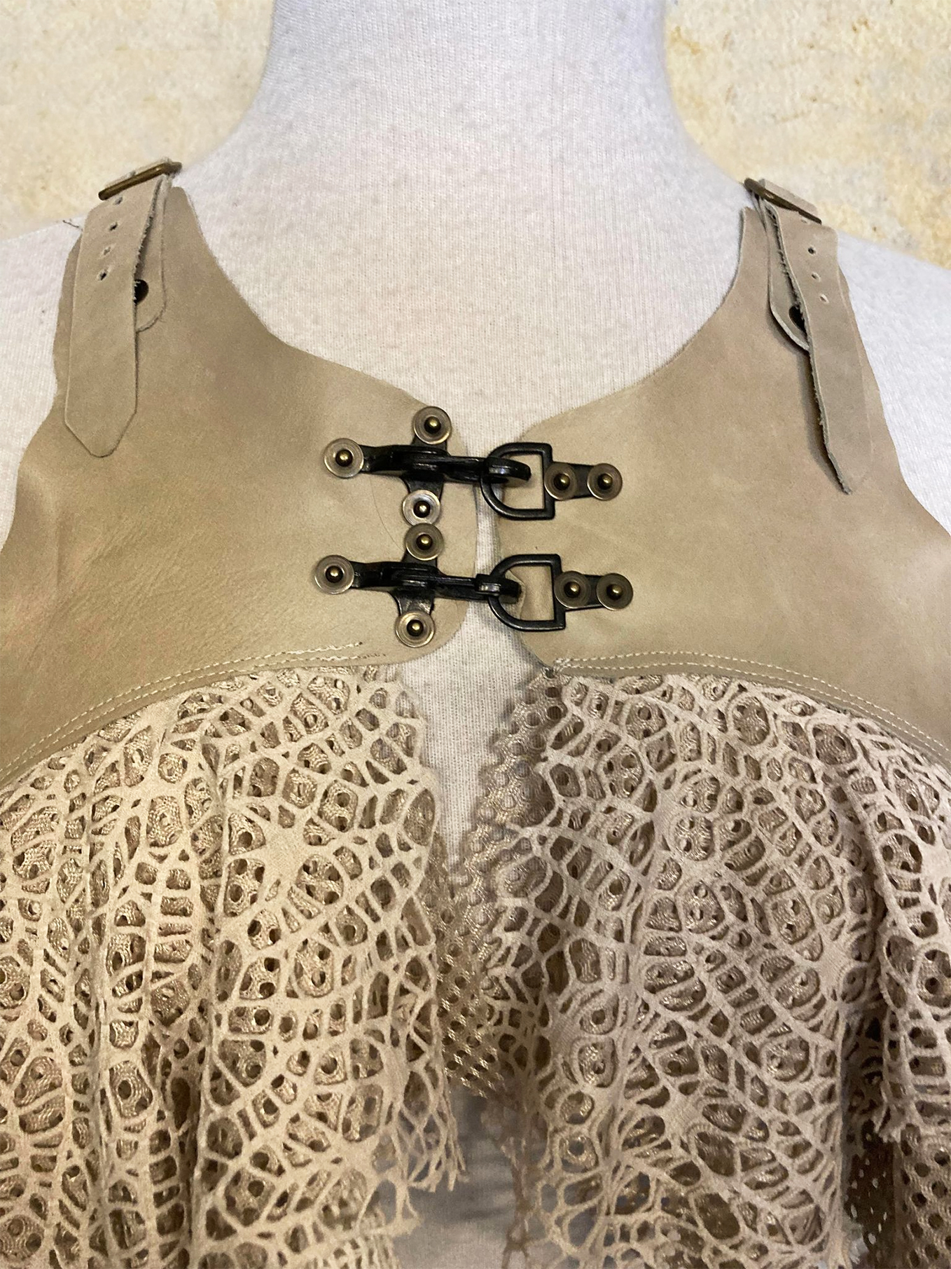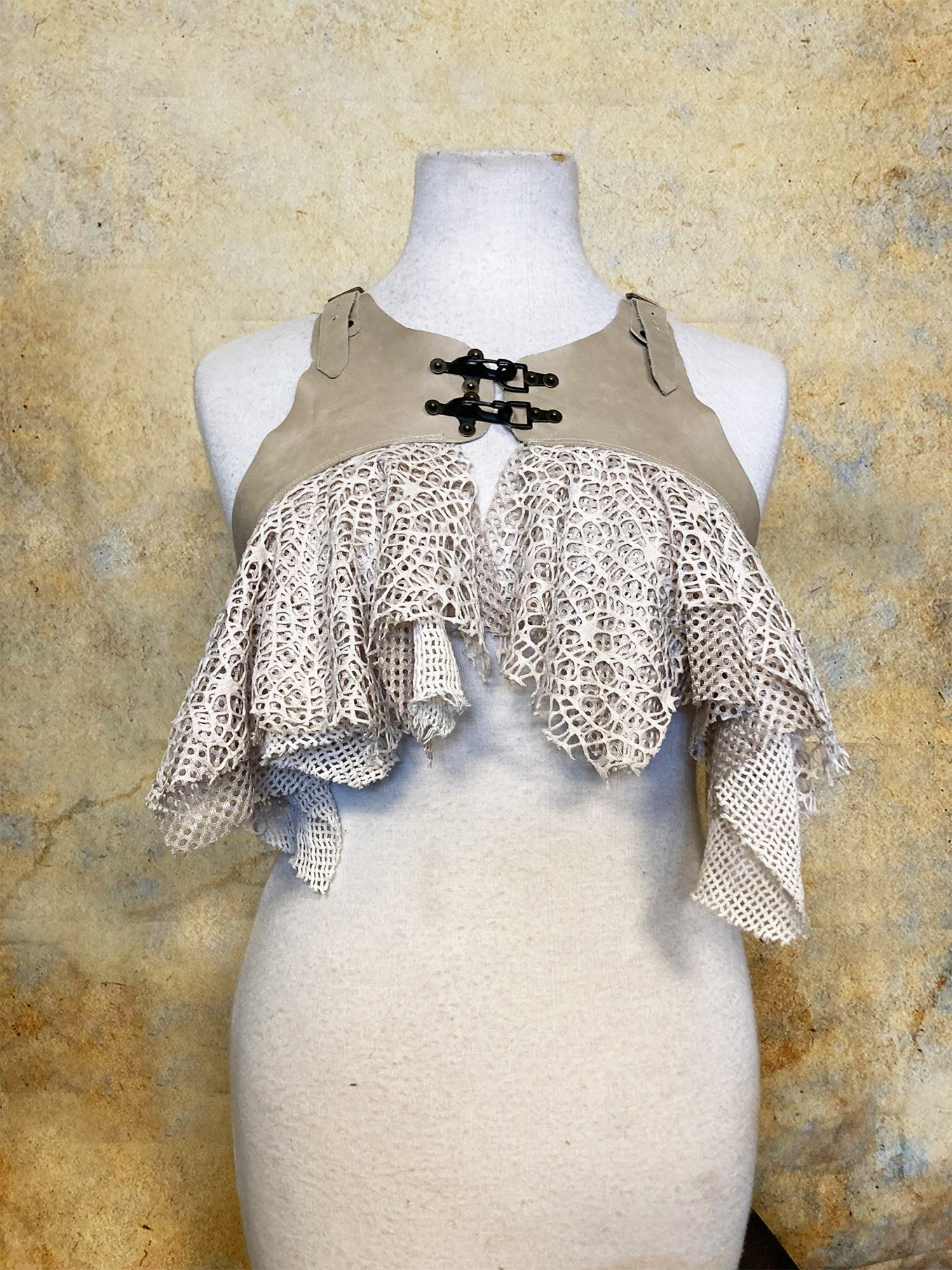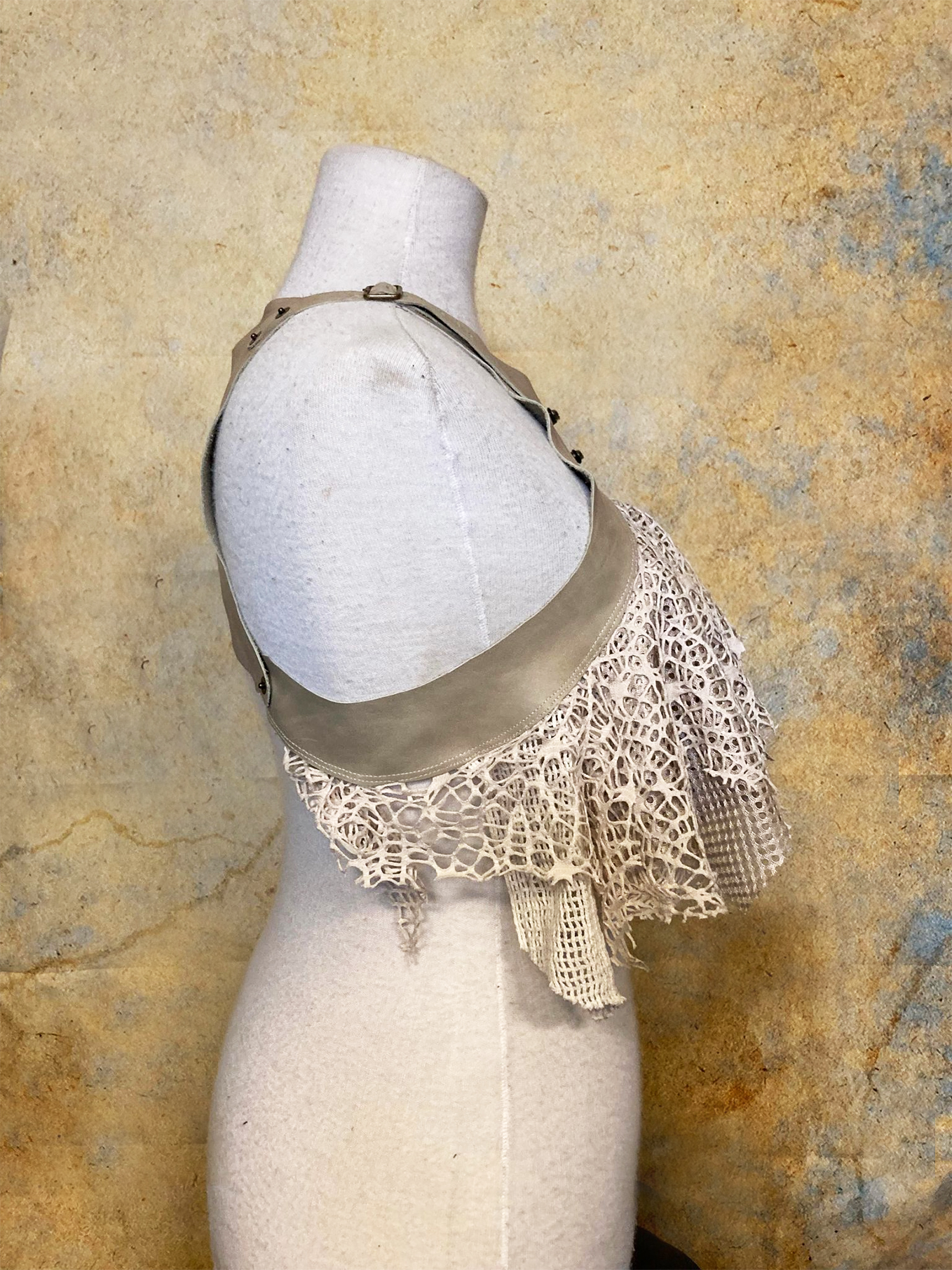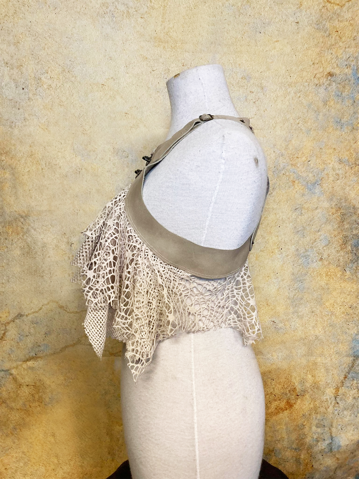 Luscious top made from soft offwhite leather and several different kinds of mesh fabric.