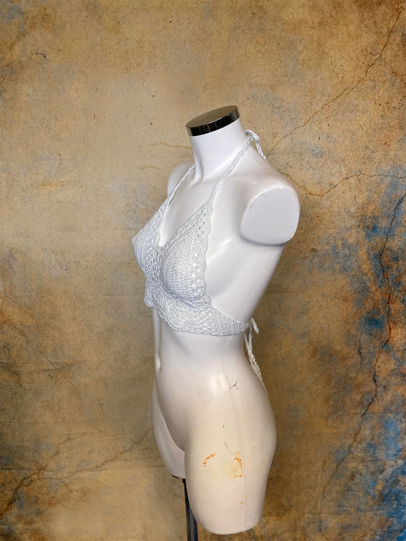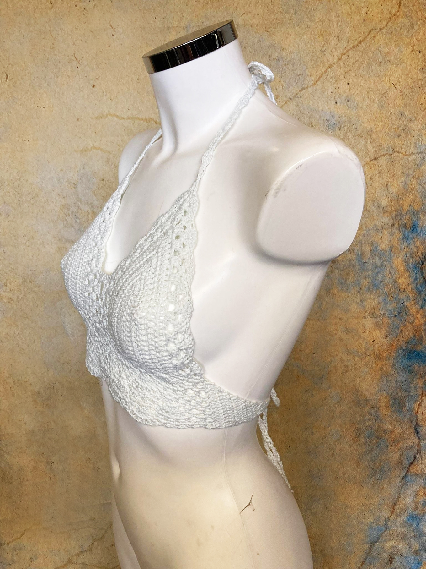 Comfortable crocheted top made from white synthetic wool.