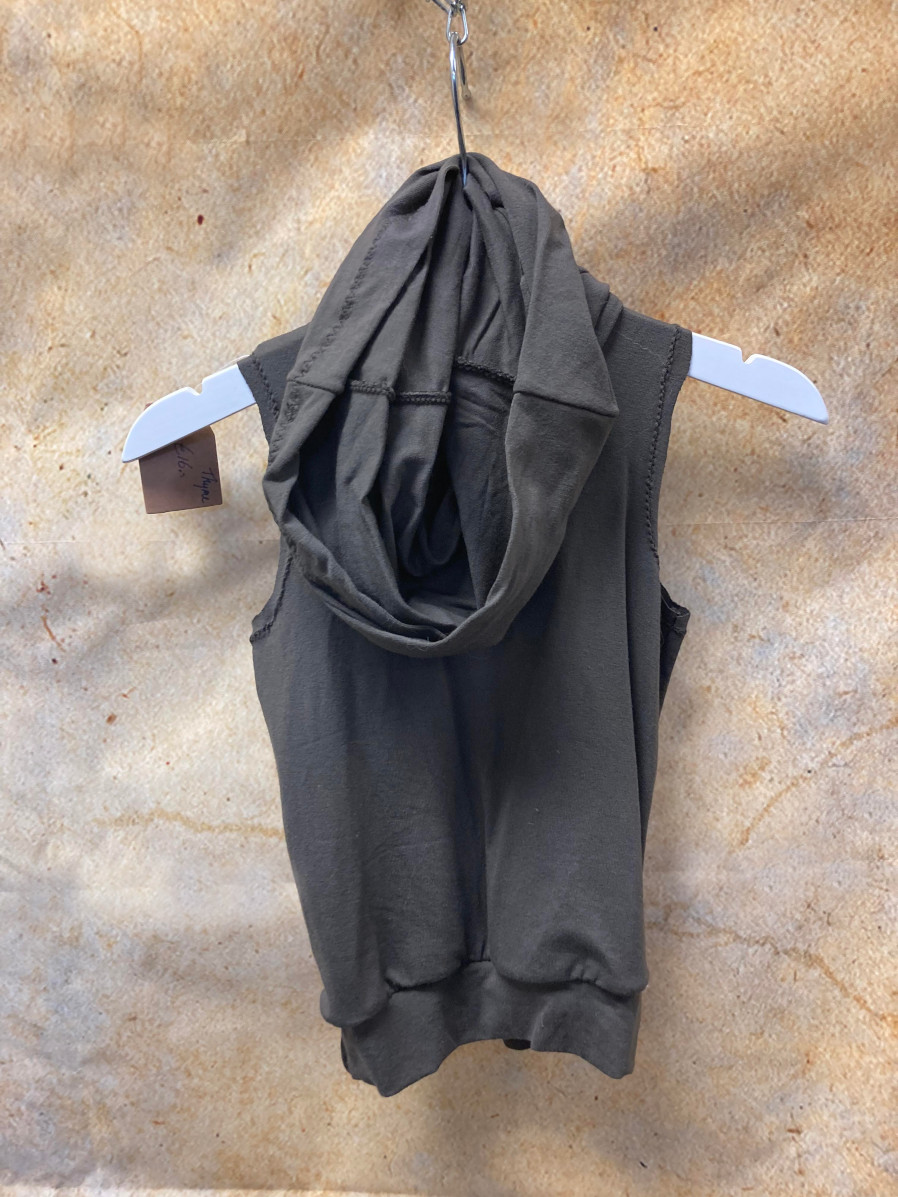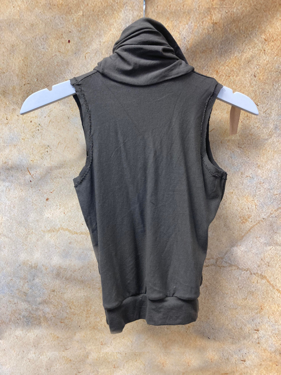 It has deliberately unfinished armholes (reinforced with stitching), a stretchy waistband and a very high comfortable cowl neck that can also be worn up as a hood.
