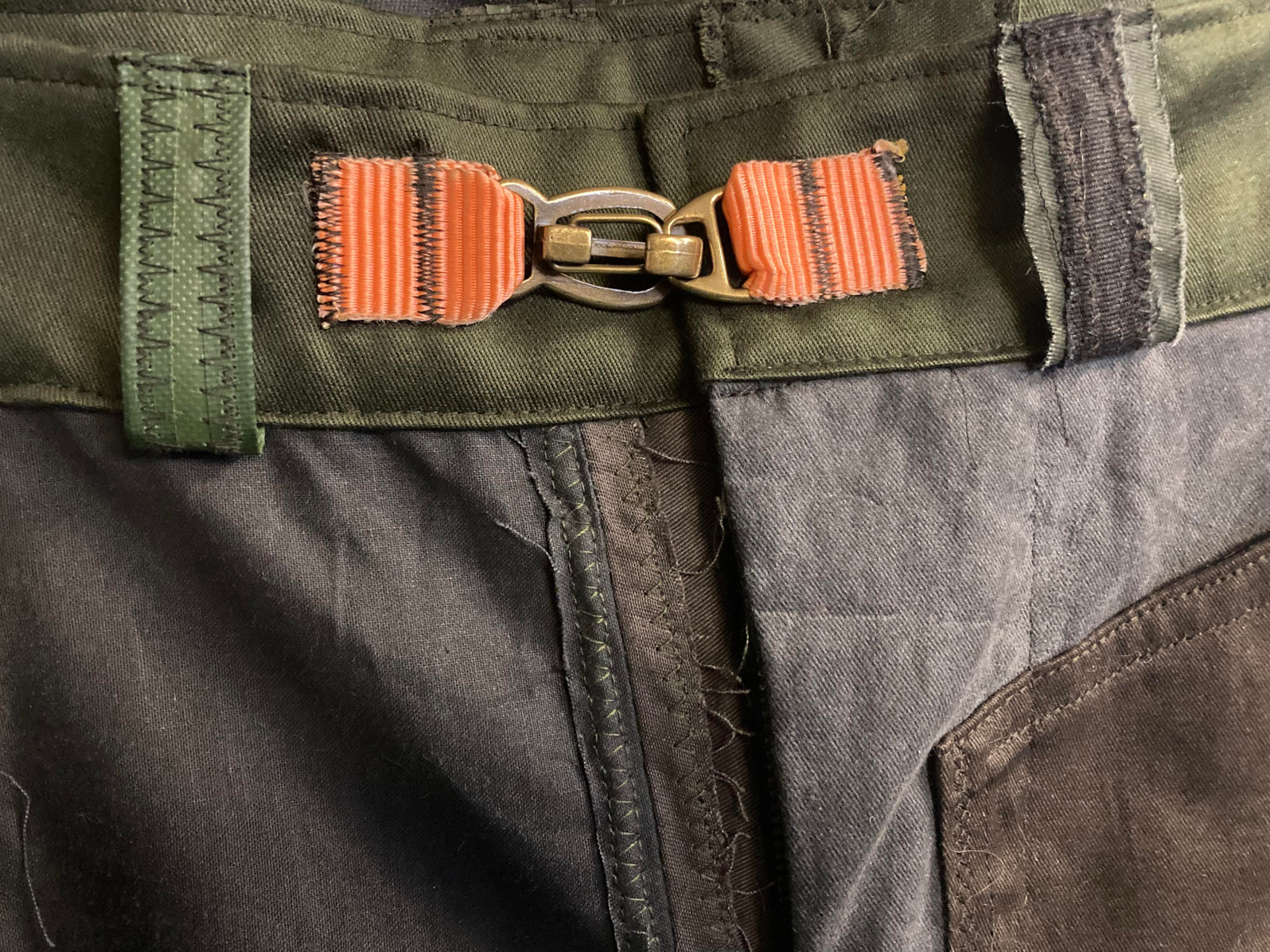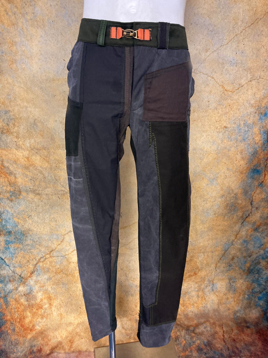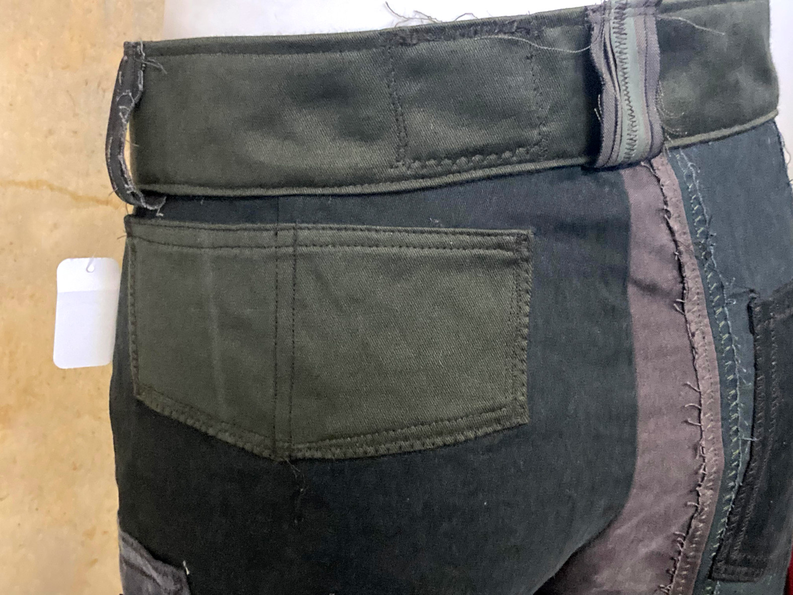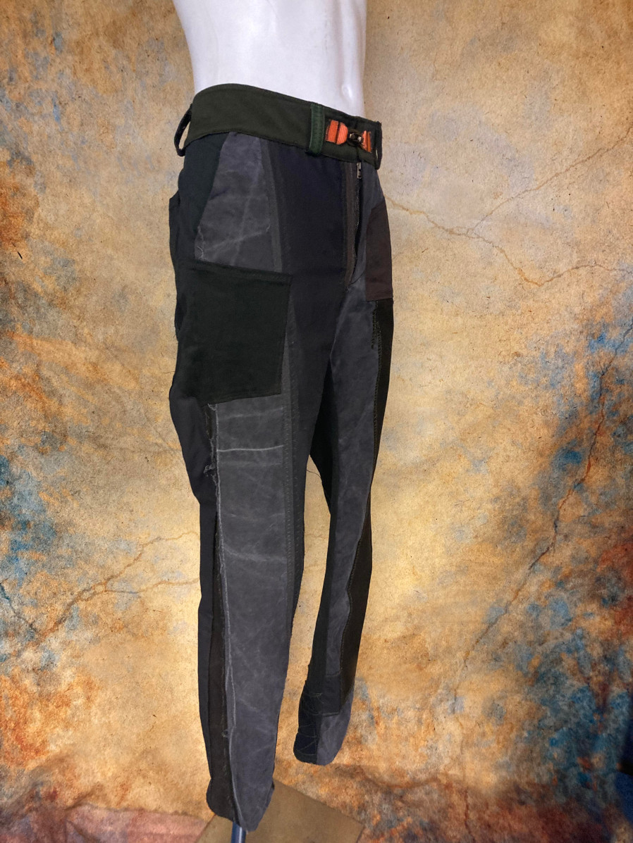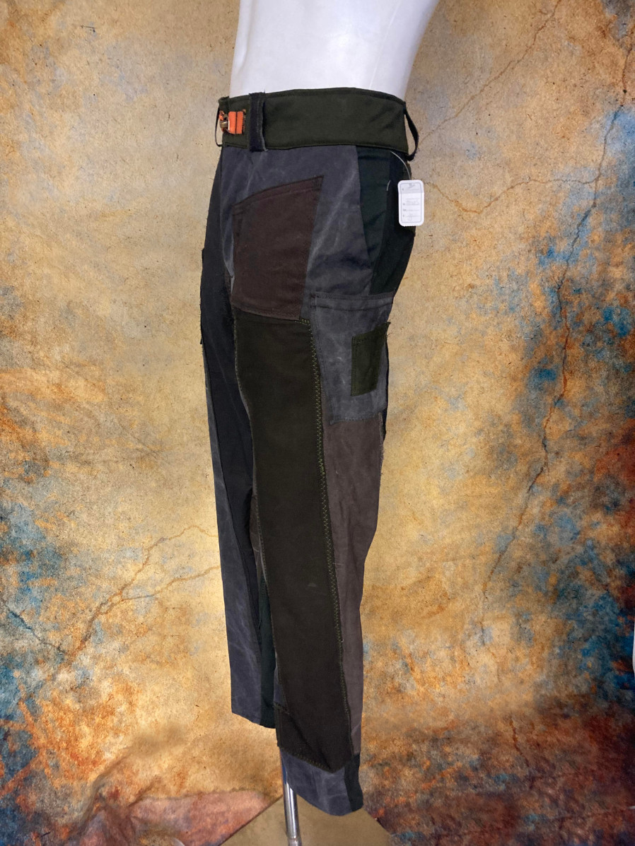 Classically shaped trousers with a wider, comfortable fit, lots and lots of irregular pockets stitched on. The Mars trousers are made from many different pieces of sturdy reclaimed cotton stitched together with decorative stitching. Many seams have deliberate raw edges or ‘inside out seams’ that will take on a more weathered look when washed more often, but every seam and fabric edge is secured with stitching to ensure you will fall apart before these trousers ever will!