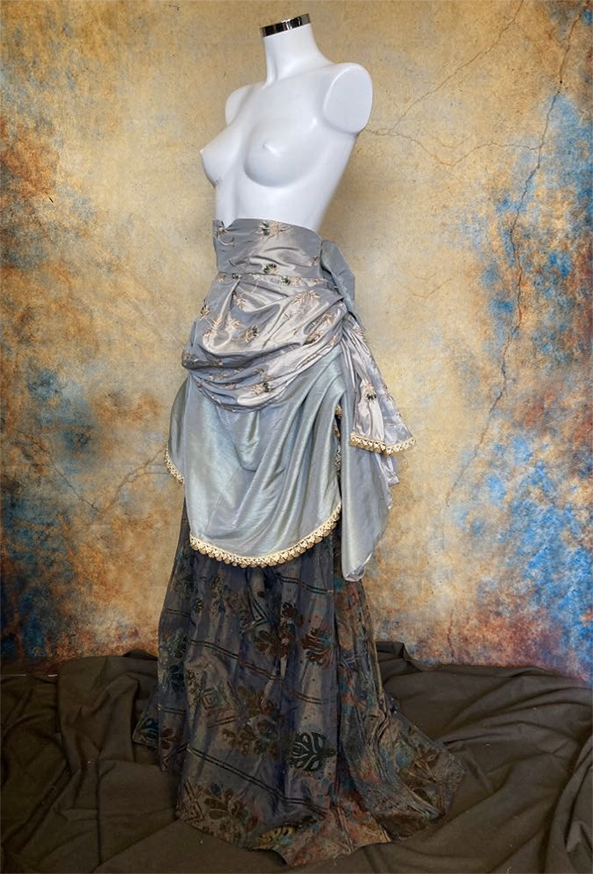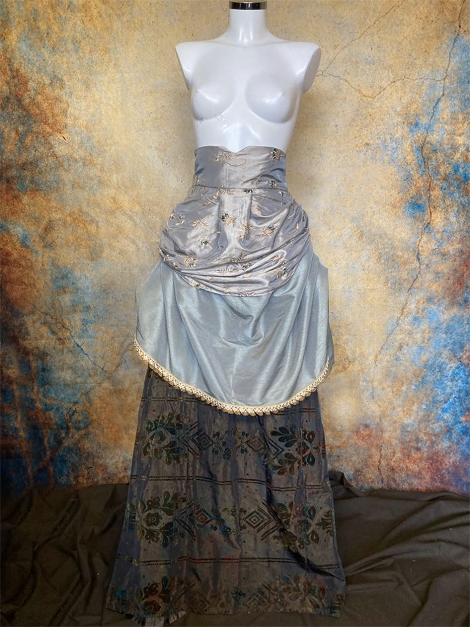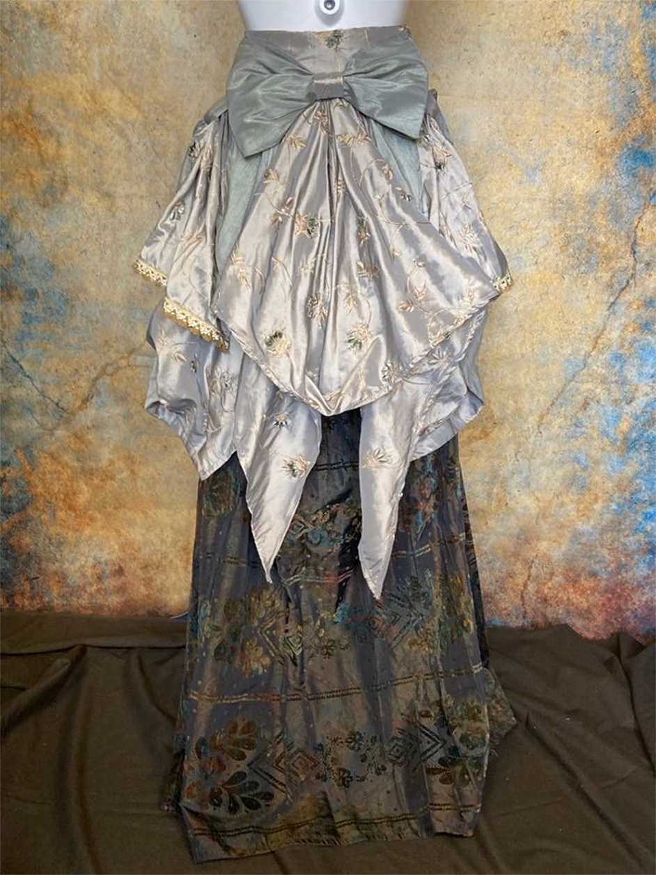 Victorian skirt made from many draped metres of Mint green taffeta, Silver green taffeta with gold embroidery and Dark green taffeta with green flock print. It has a Luscious bow at the back and is trimmed with elaborate greengold trimming.