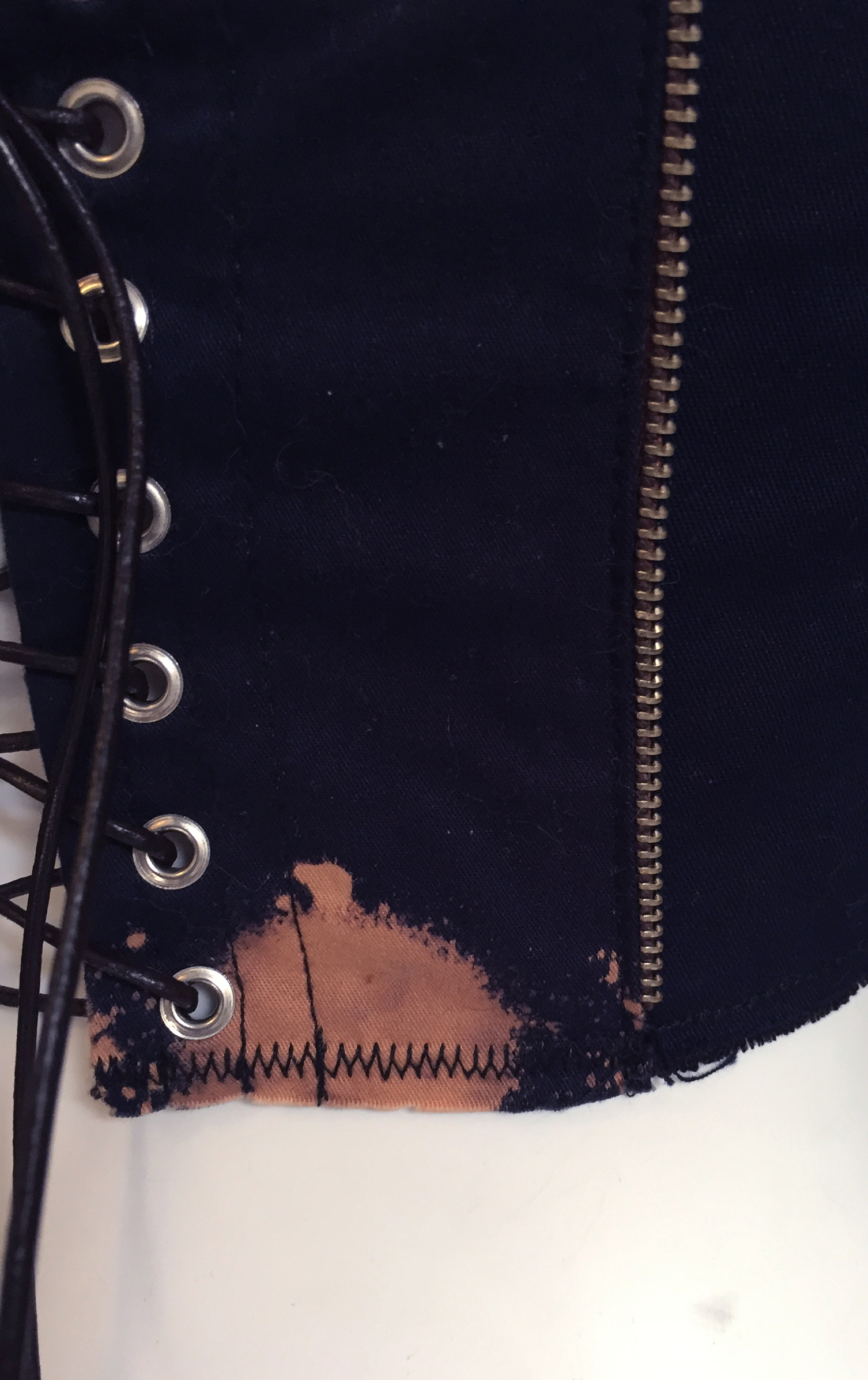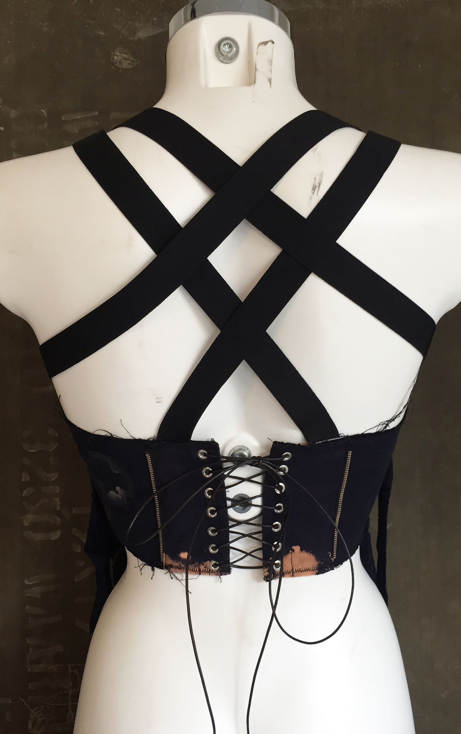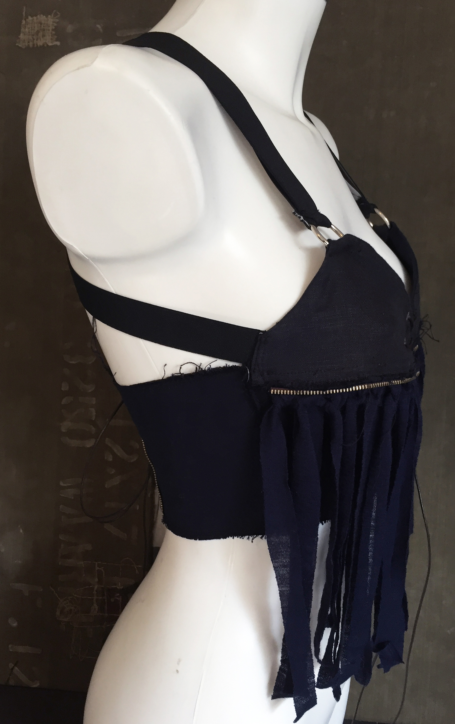 Made from blue cotton and jersey with tassles and zipper elements at the front cups.